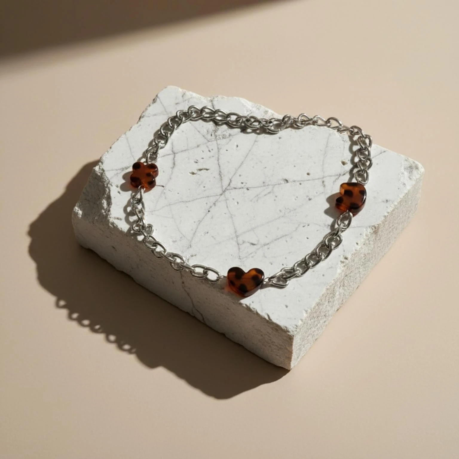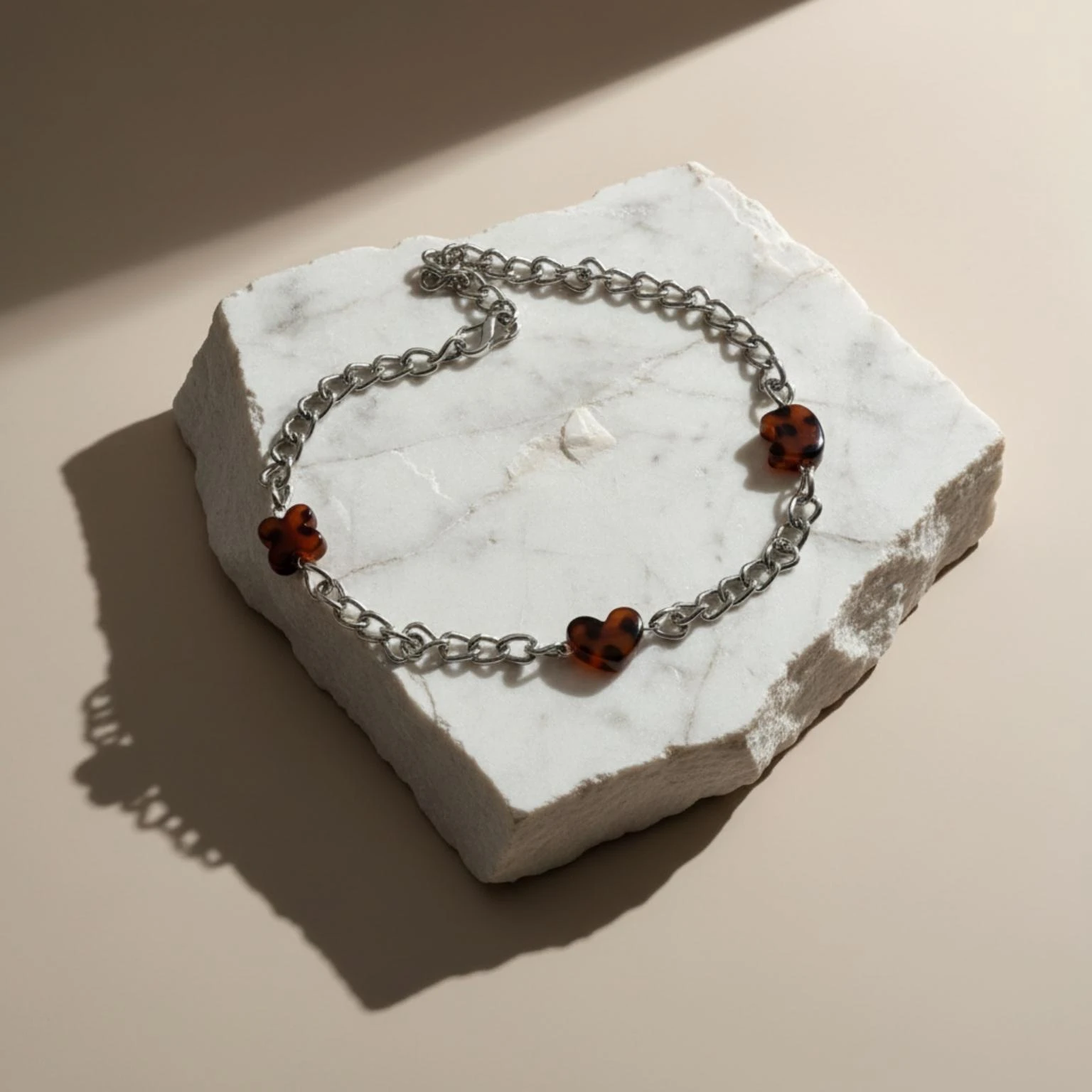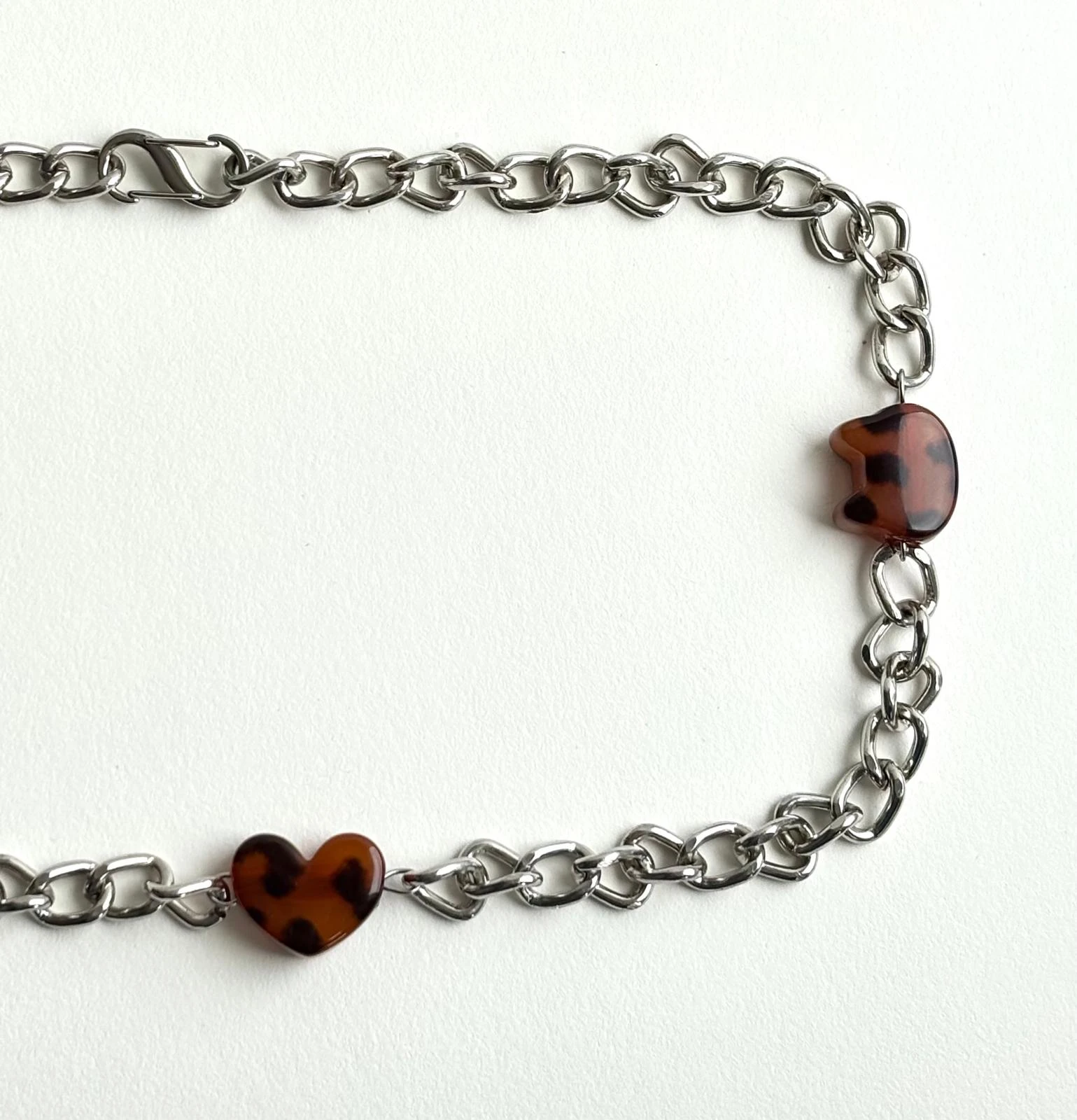 Naszyjnik ze stali chirurgicznej, posrebrzany. Ozdobiony elementami z akrylu w tonacji brązowej . Długość regulowana maksymalnie 50 cm. Zapinany na wysokiej jakości karabinek regulowany z obu stron.
