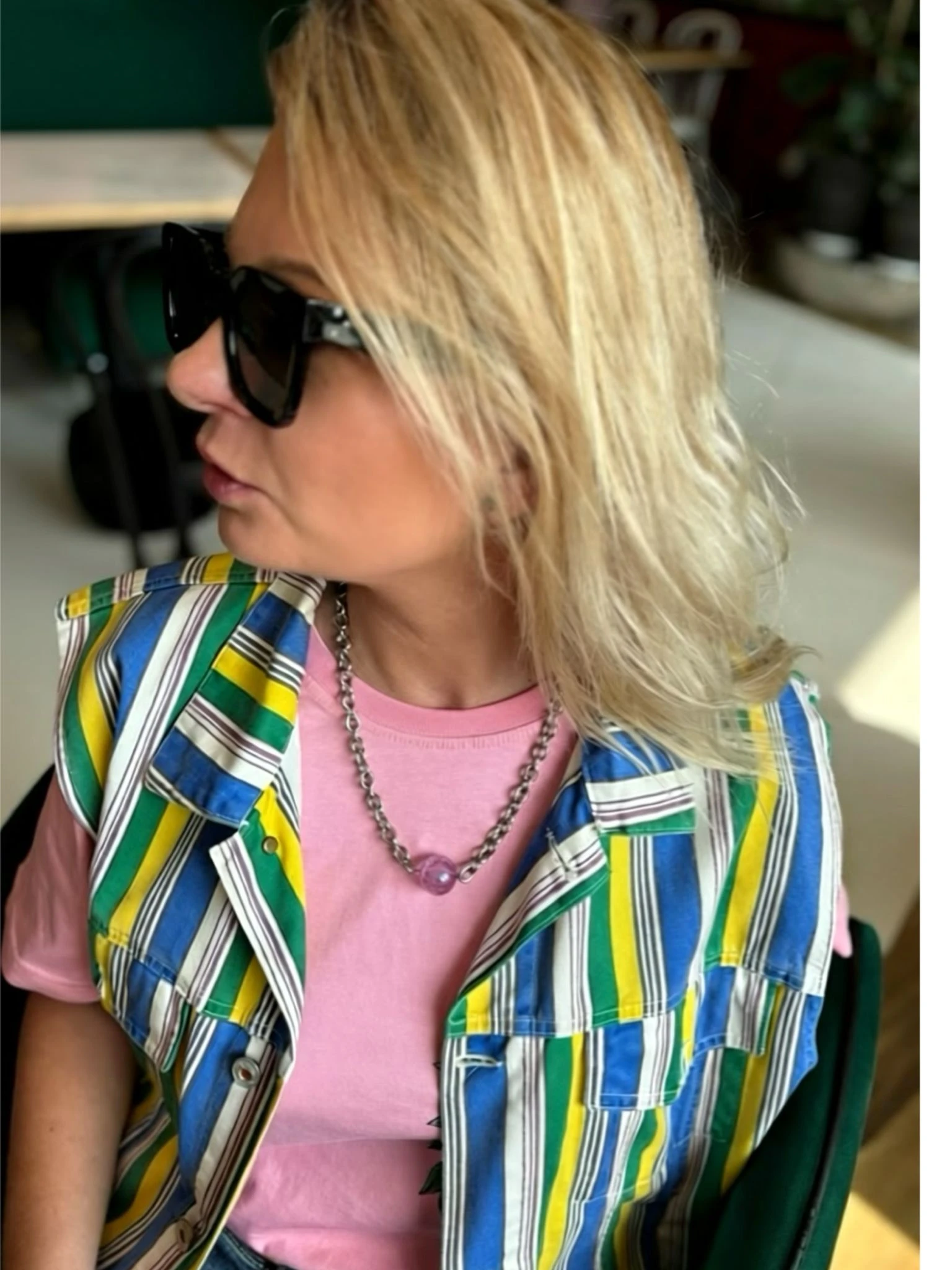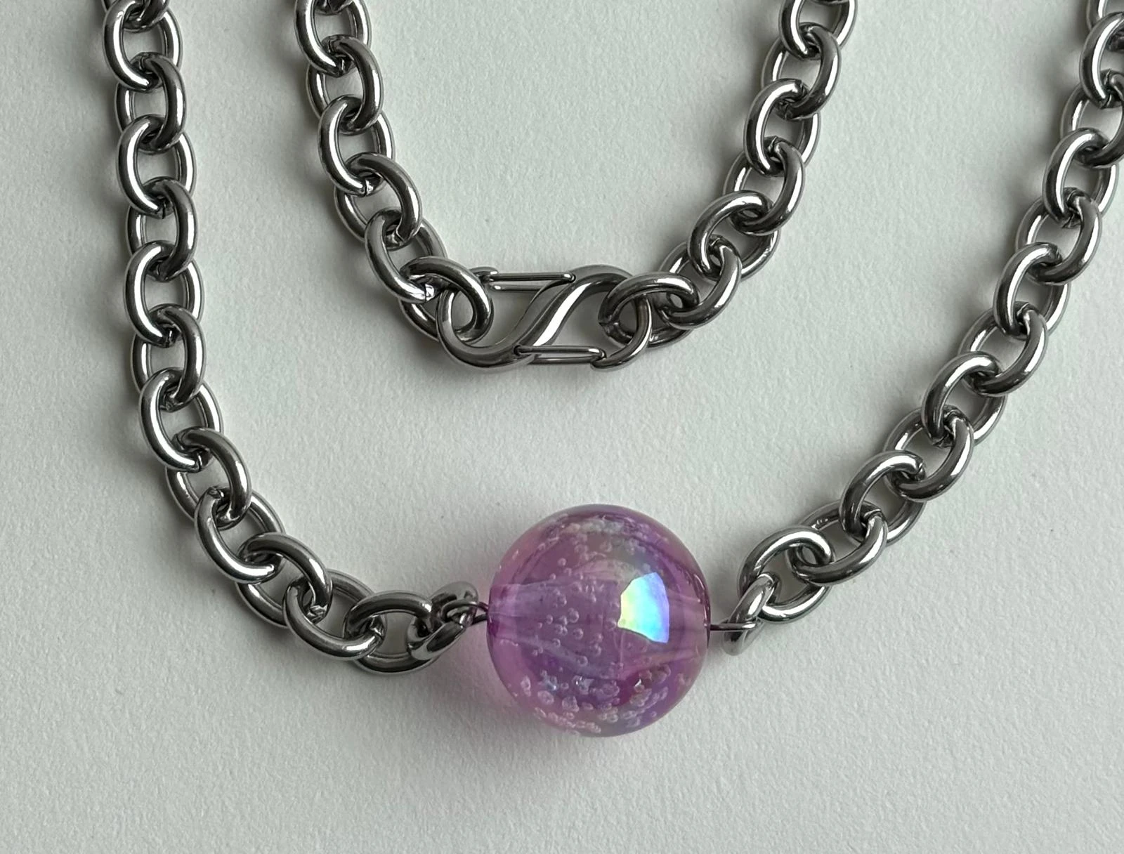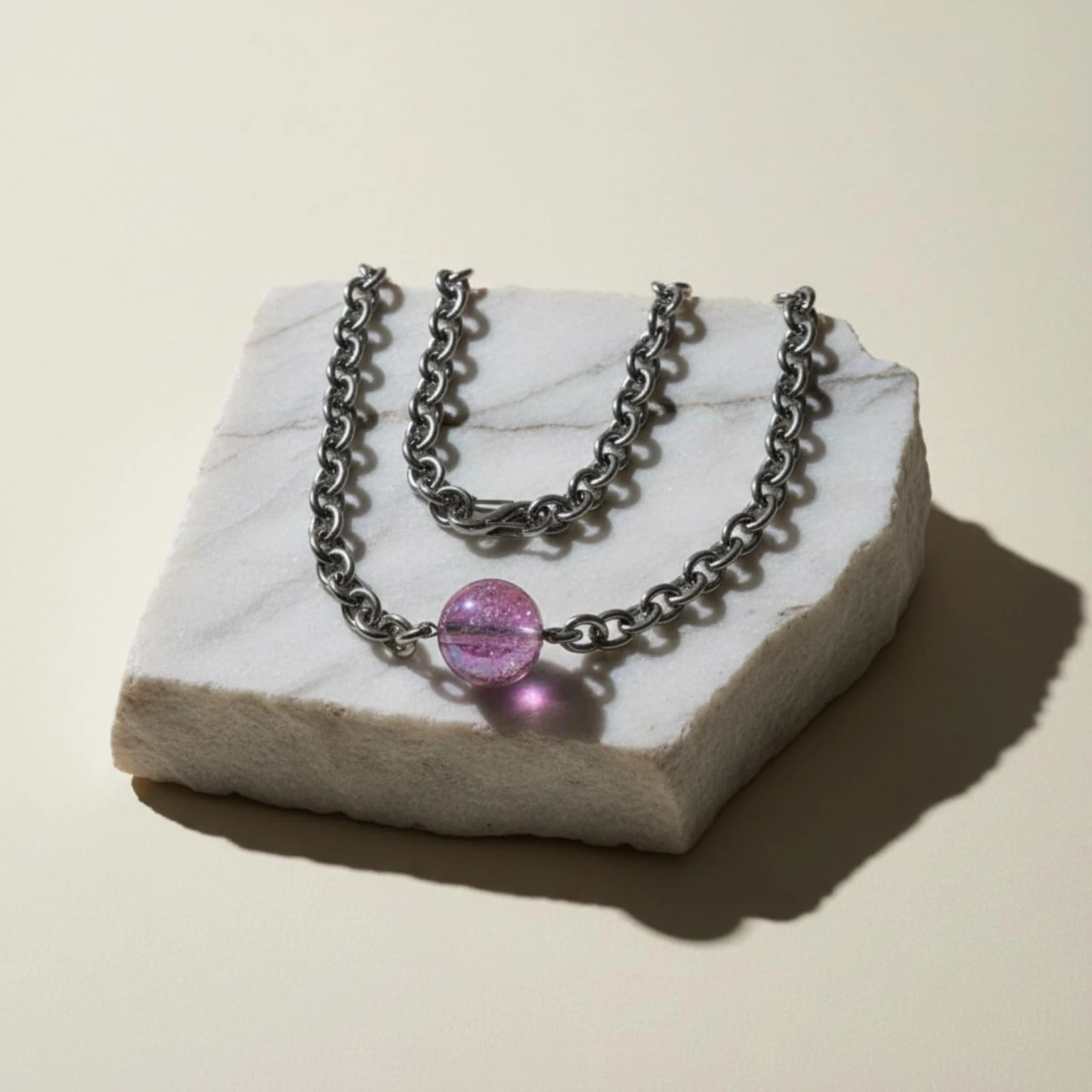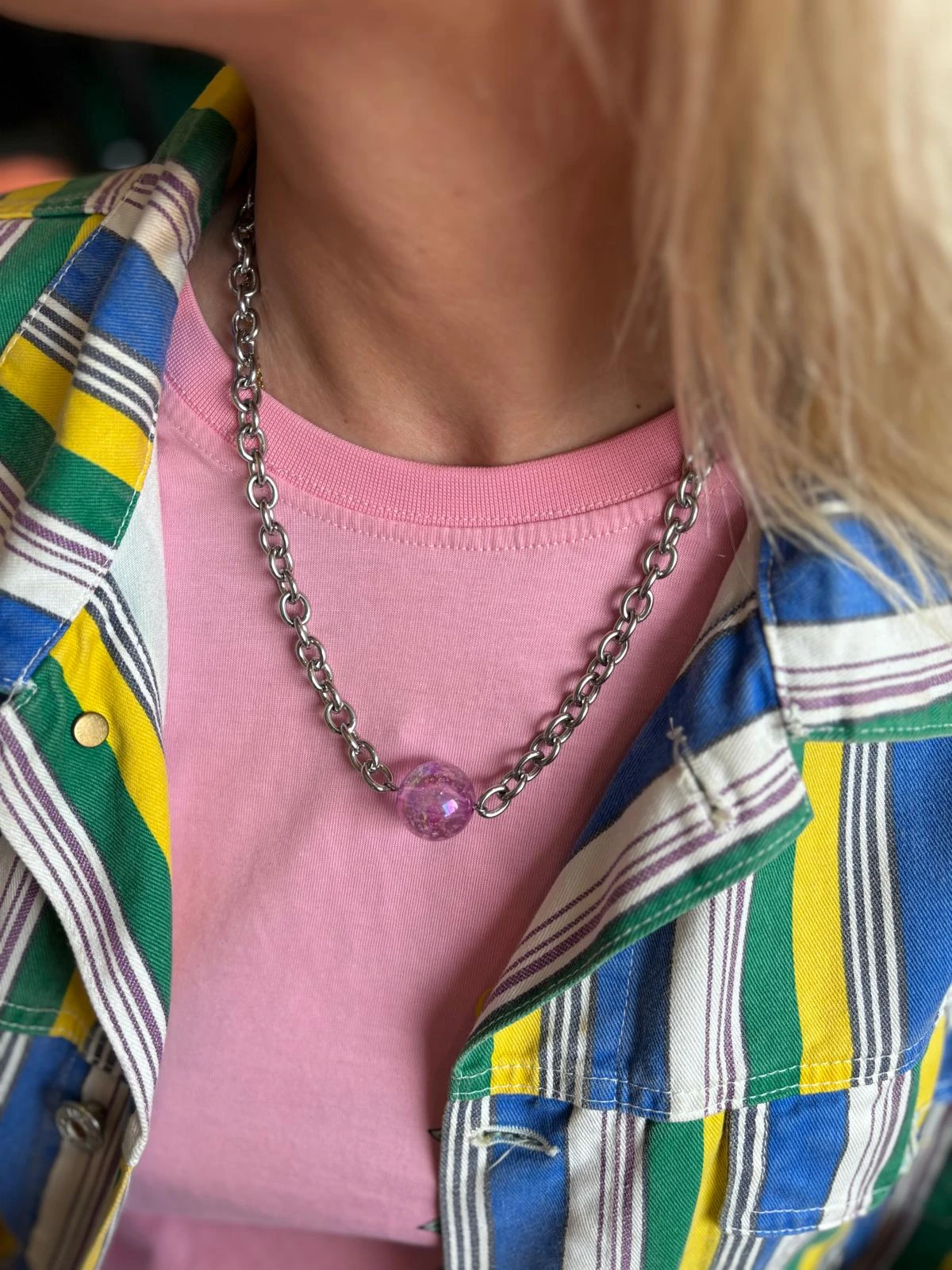 Naszyjnik ze stali chirurgicznej, posrebrzany. Kula wykonana z transparentnego różowego akrylu . Długość regulowana maksymalnie 50 cm. Zapinany na wysokiej jakości karabinek regulowany z obu stron.