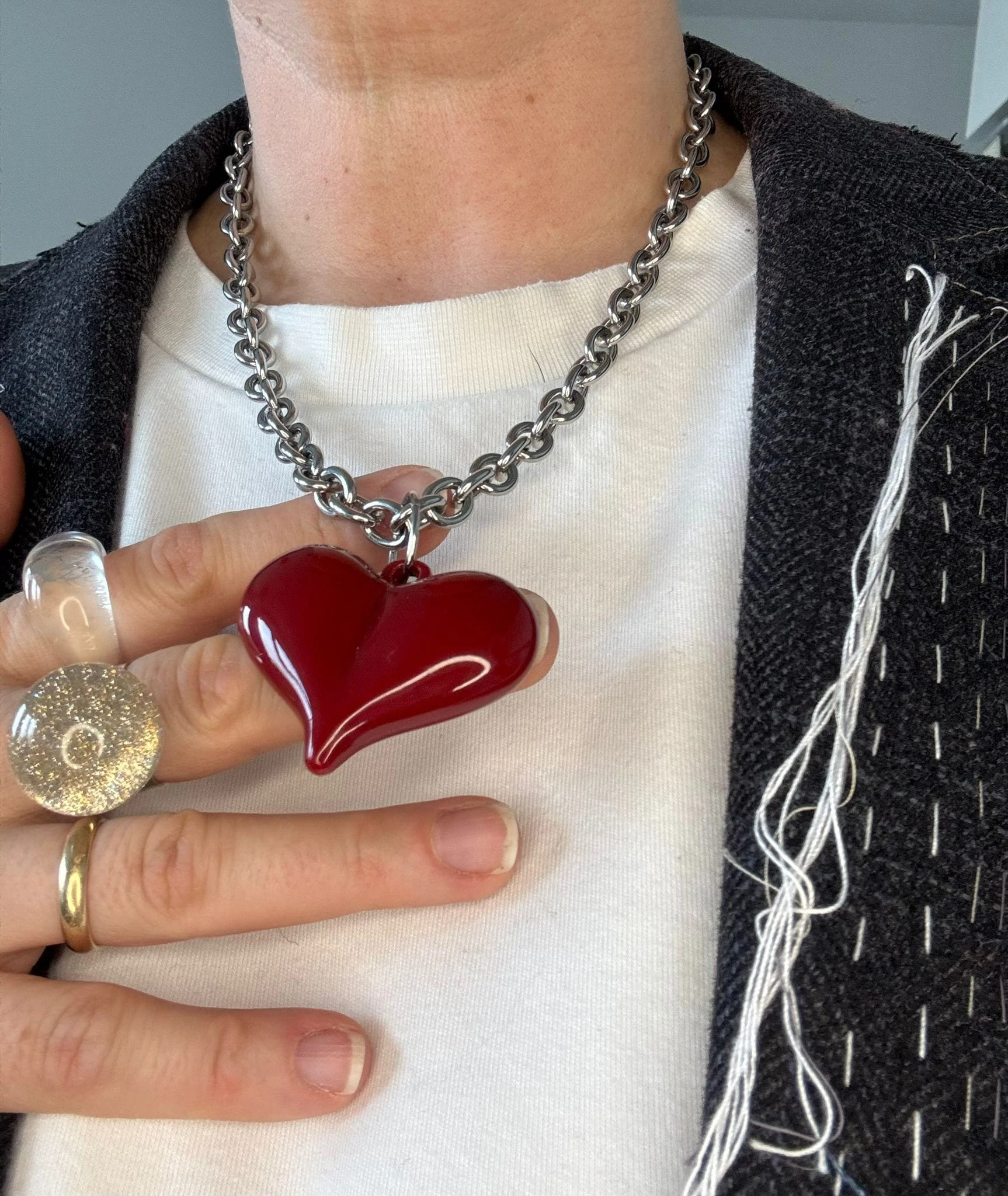 Naszyjnik ze stali chirurgicznej, posrebrzany. Serce wykonane z akrylu. Długość regulowana maksymalnie 50 cm. Zapinany na wysokiej jakości karabinek regulowany z obu stron.