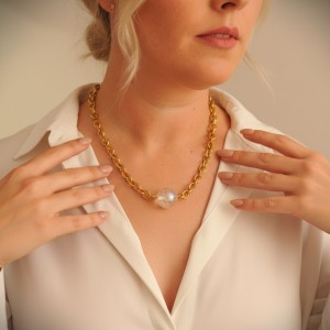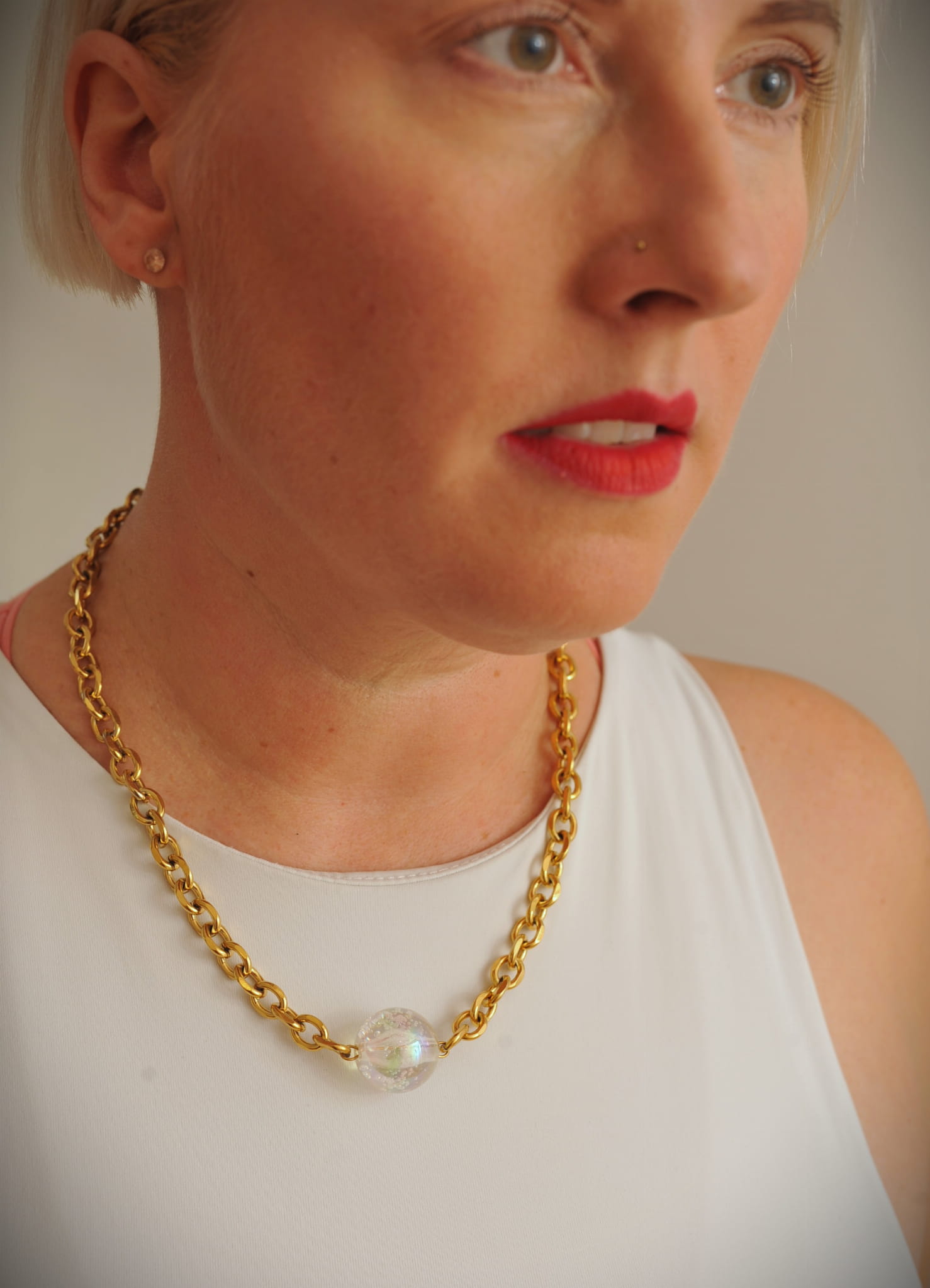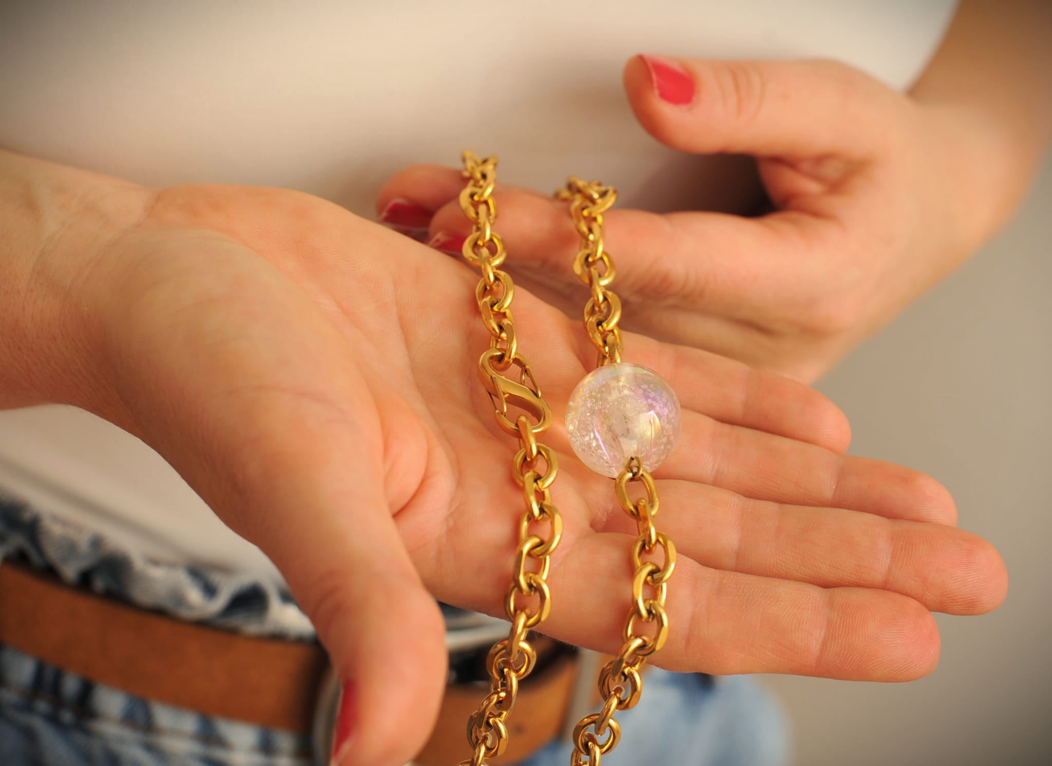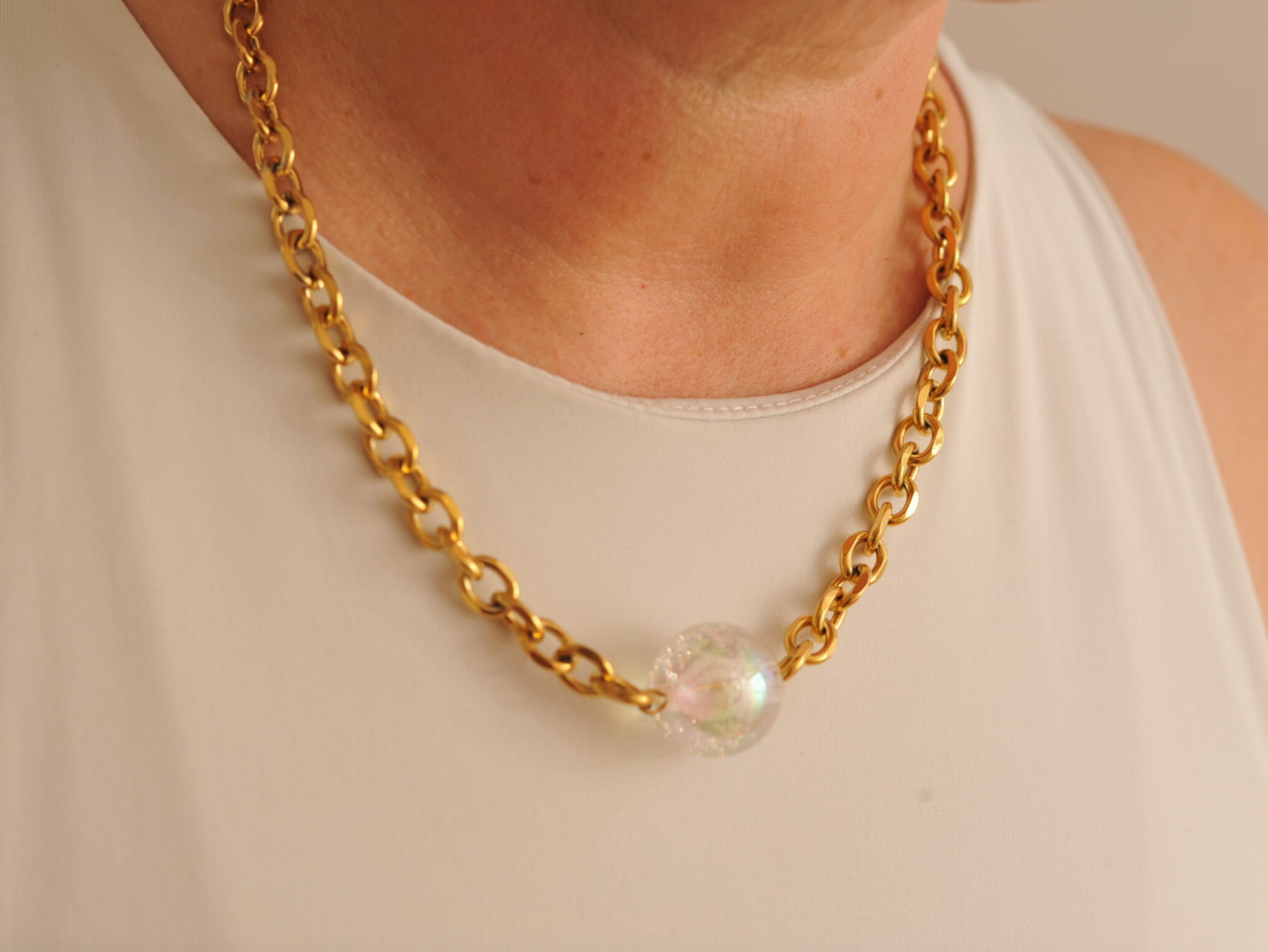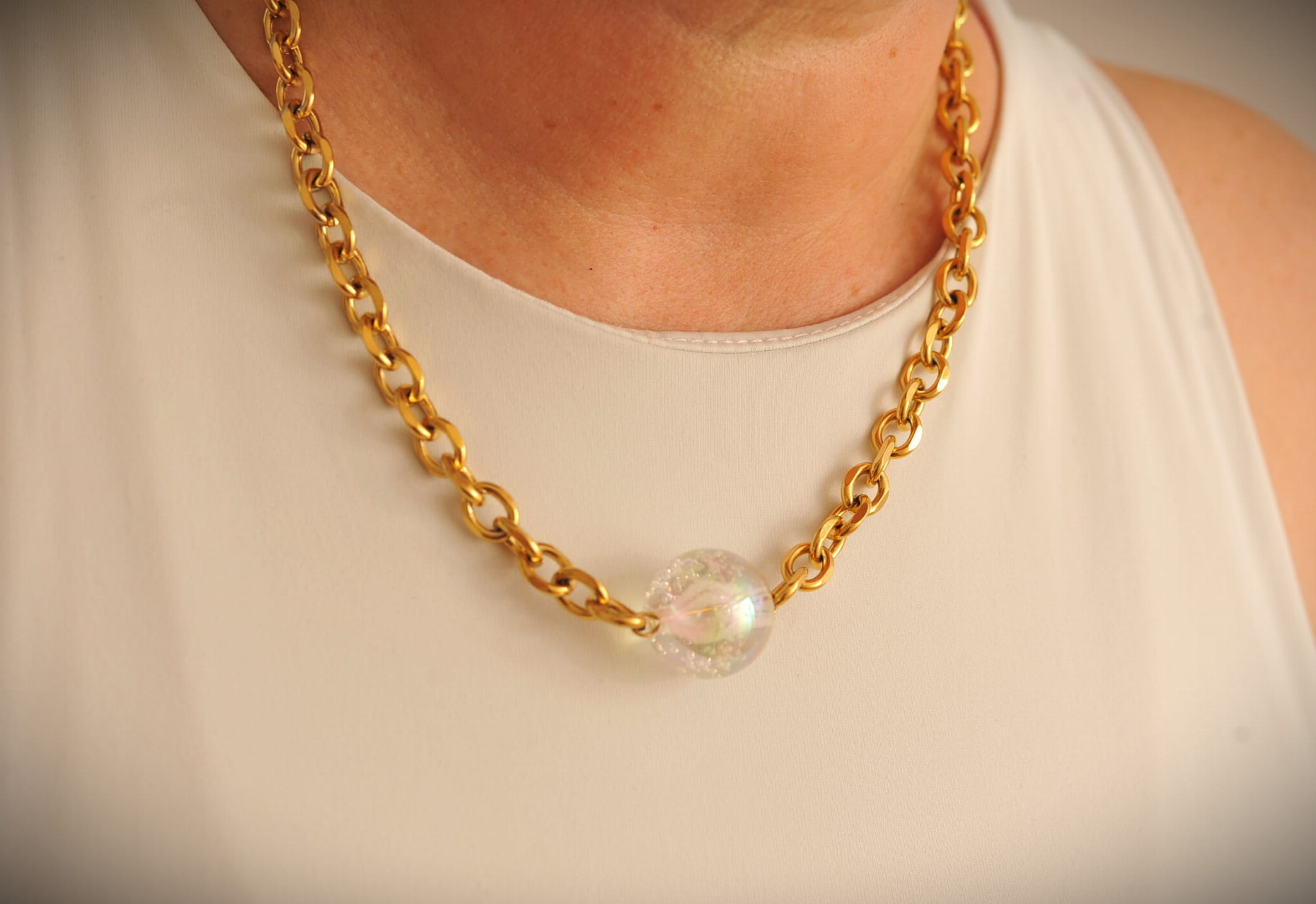 Naszyjnik ze stali chirurgicznej, pozłacany. Kula wykonana z akrylu. Długość regulowana maksymalnie 50 cm. Zapinany na wysokiej jakości karabinek regulowany z obu stron.
