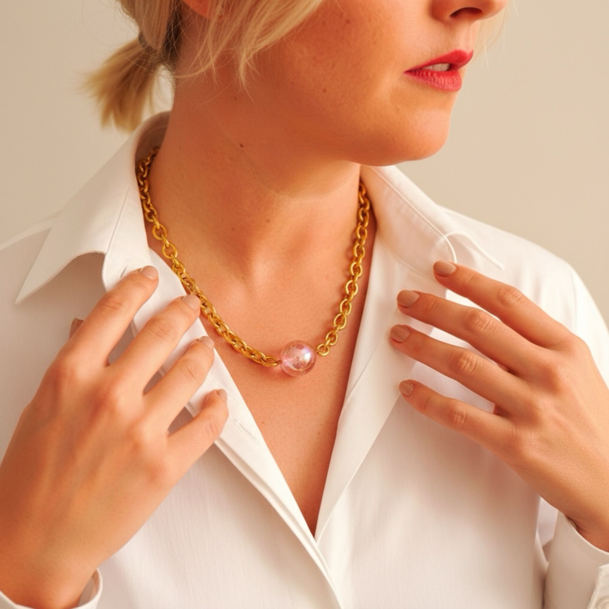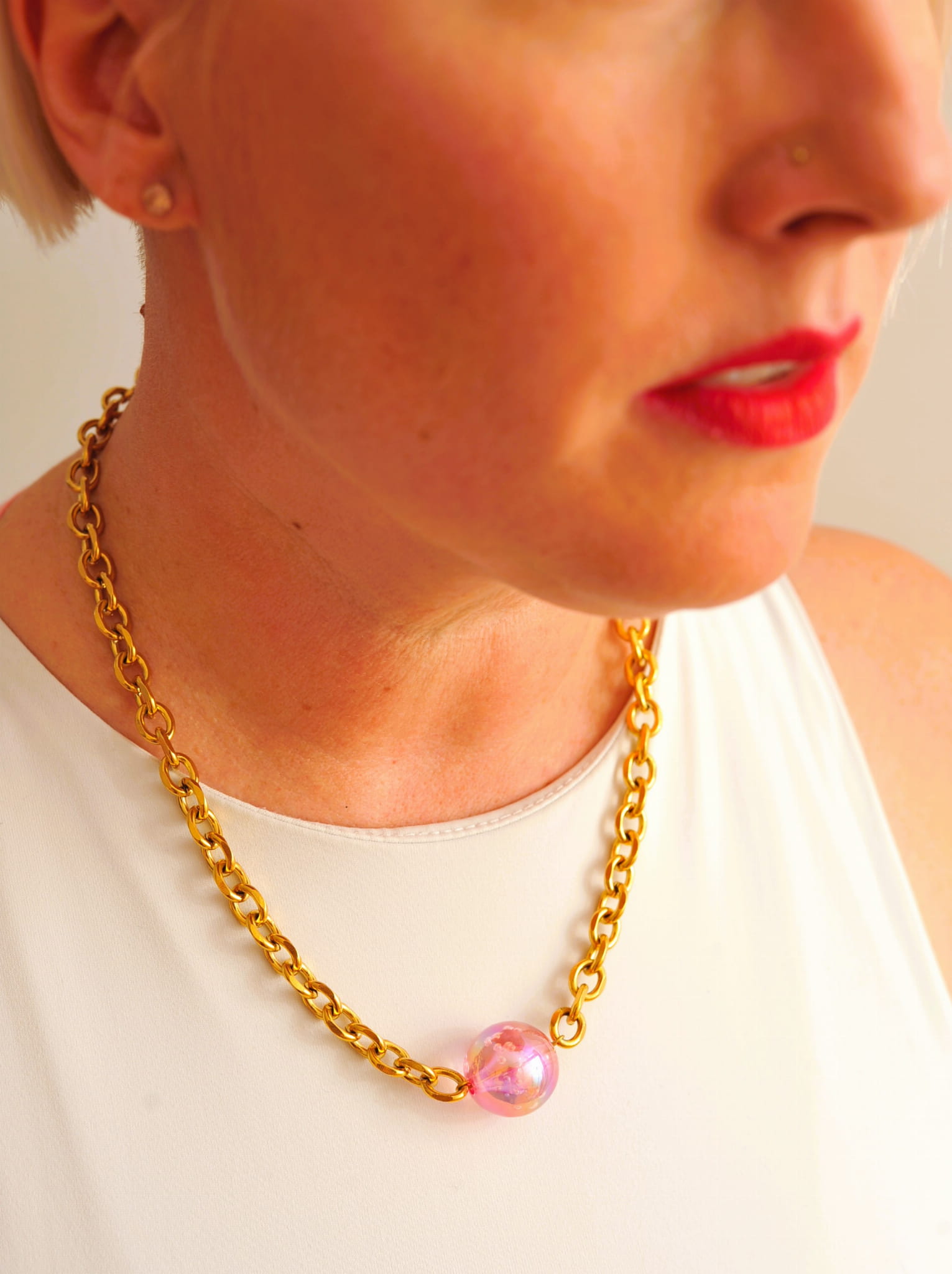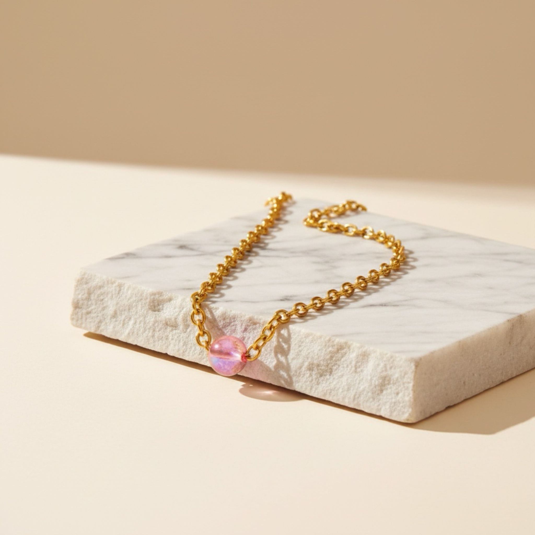 Naszyjnik ze stali chirurgicznej, pozłacany. Kula wykonana z akrylu. Długość regulowana maksymalnie 50 cm. Zapinany na wysokiej jakości karabinek regulowany z obu stron.
