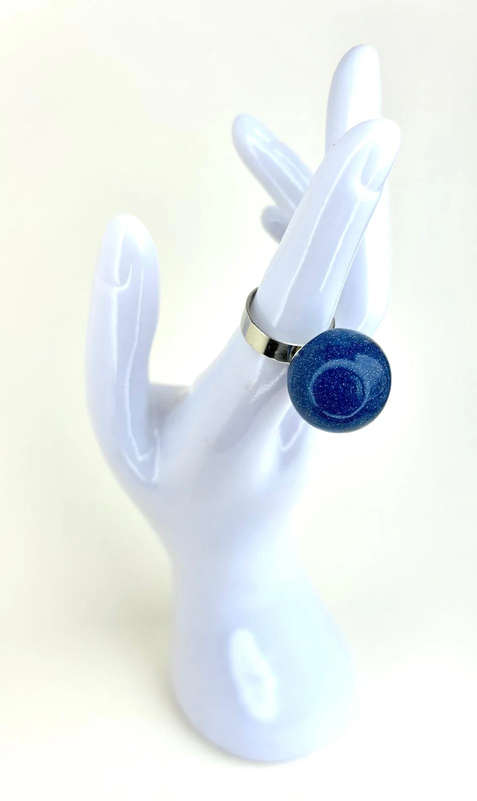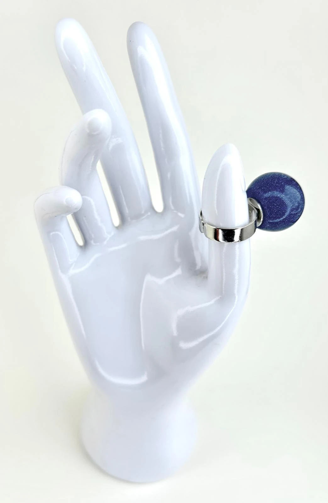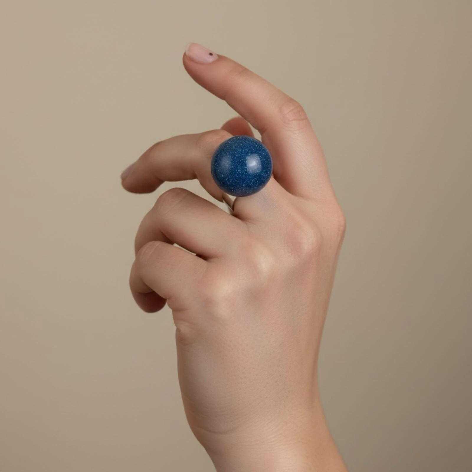Pierścionek Twins w niebiekiej odsłonie. Wykonany z akrylu i regulowanej podstawy. To połączenie klasycznego projektu z nowoczesnym wykończeniem — dla wszystkich, którzy kochają oryginalność.