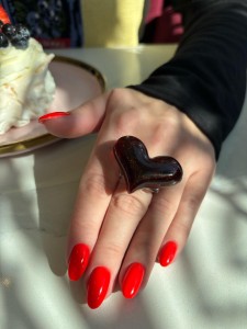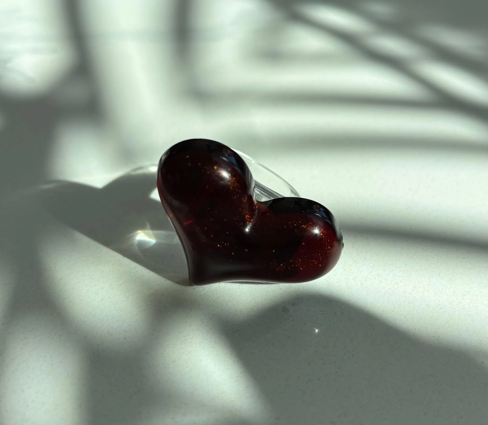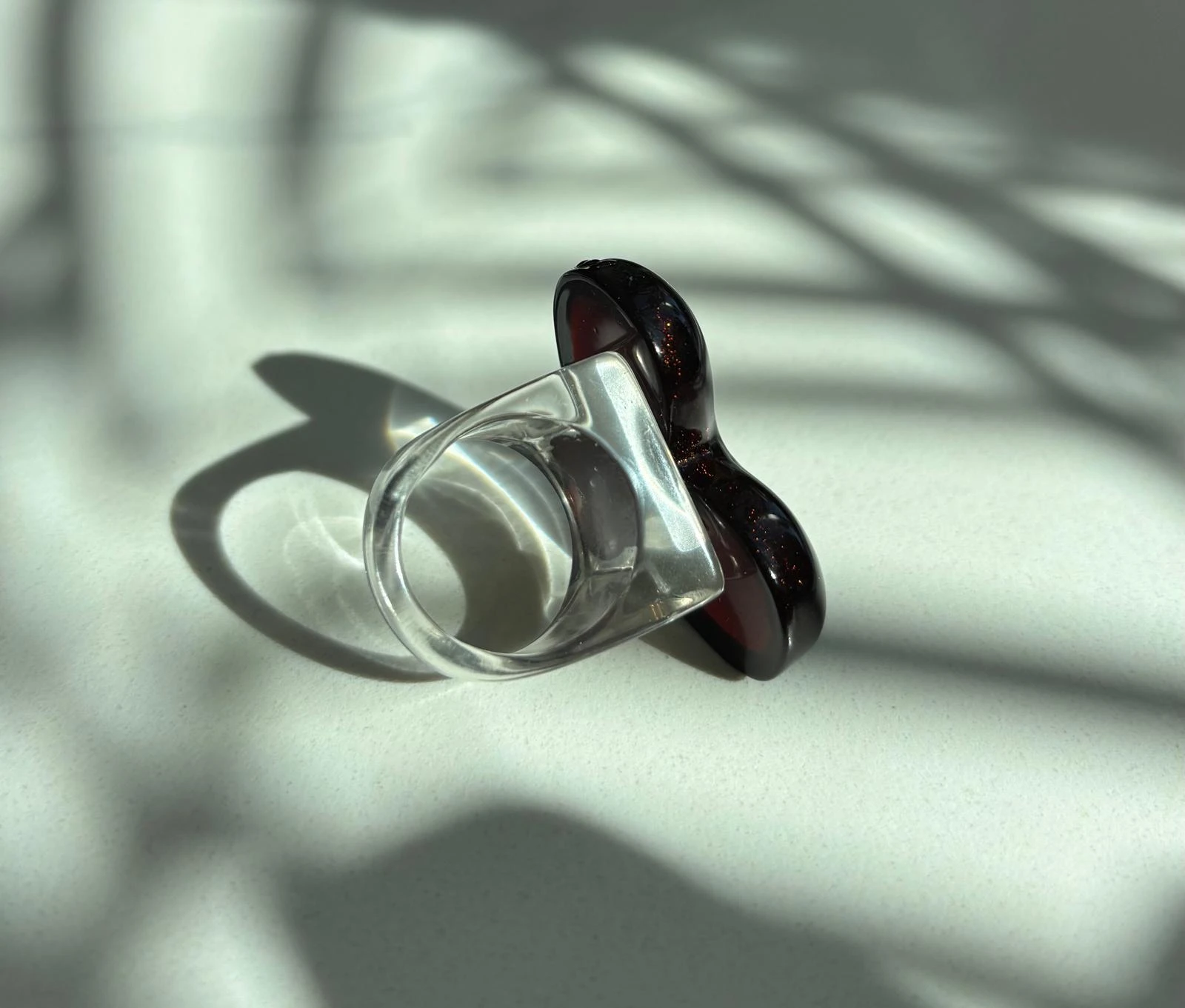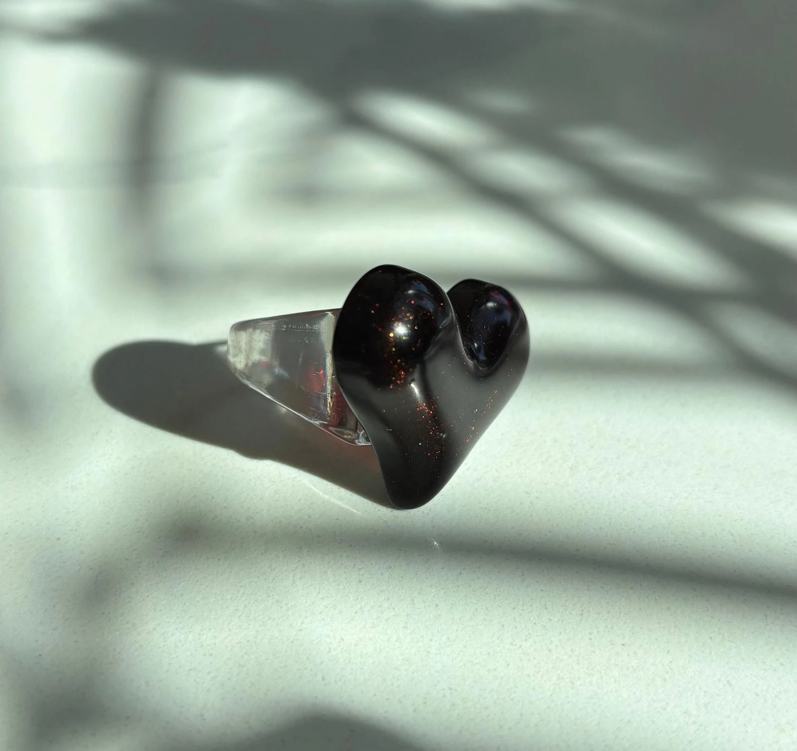 Pierścionek Twins w brązowej odsłonie. Wykonany z akrylu. Duże serce z odrobina brokatu. To połączenie klasycznego projektu z nowoczesnym wykończeniem — dla wszystkich, którzy kochają oryginalność.
