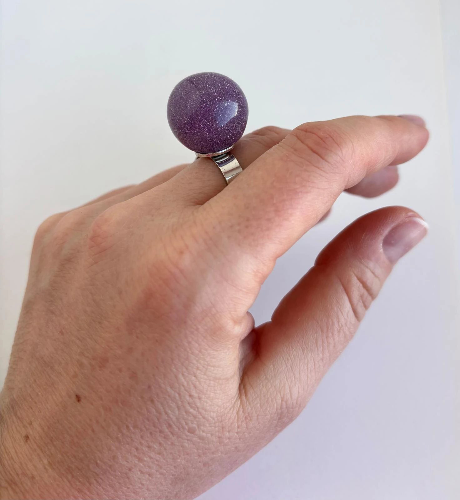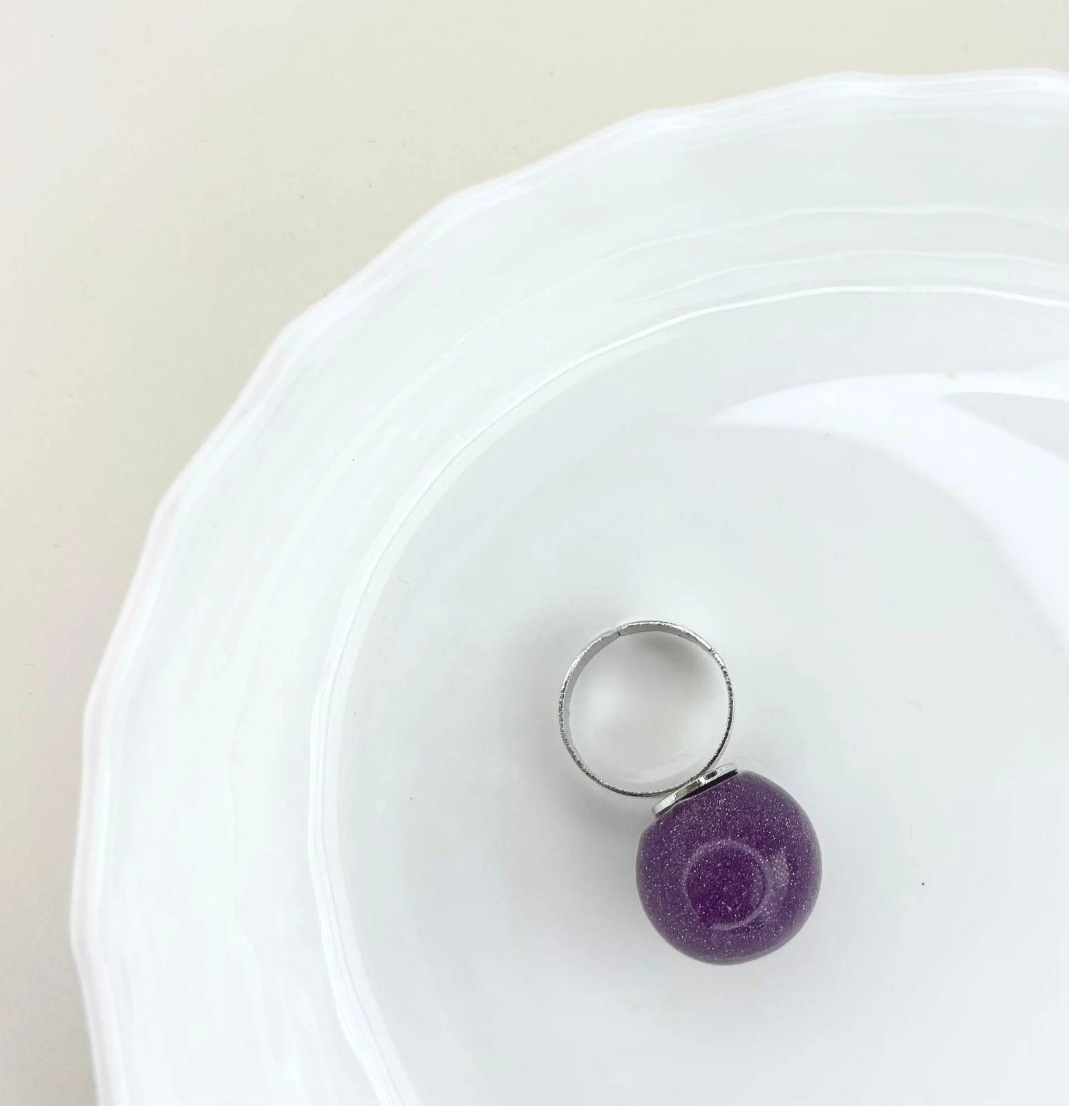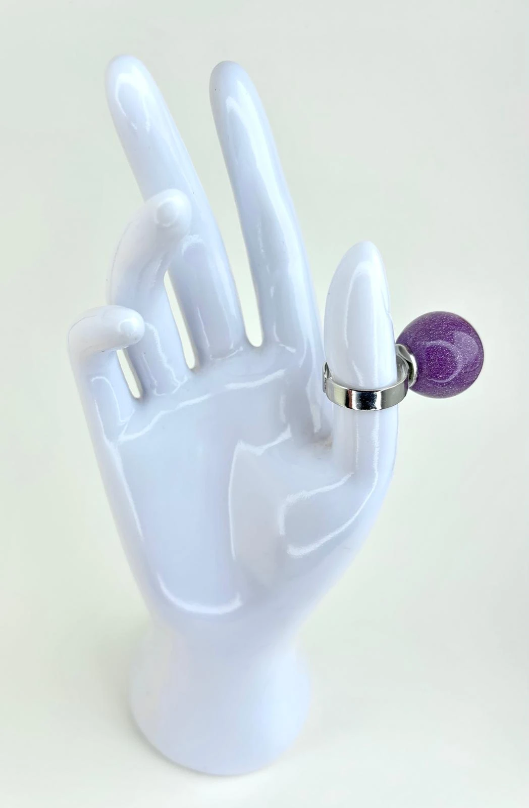Pierścionek Twins w fioletowej odsłonie. Wykonany z akrylu i regulowanej podstawy. To połączenie klasycznego projektu z nowoczesnym wykończeniem — dla wszystkich, którzy kochają oryginalność.