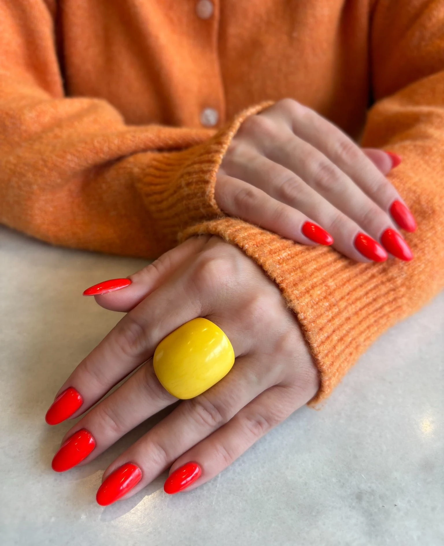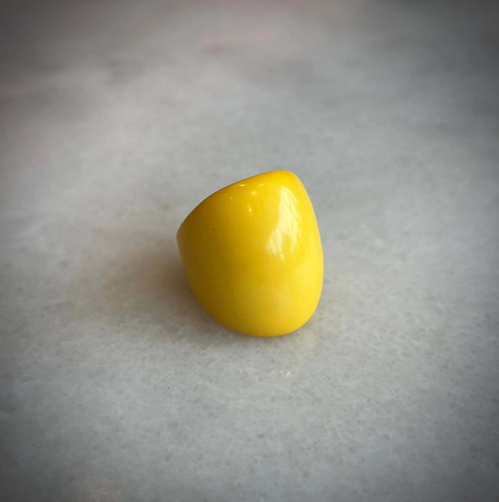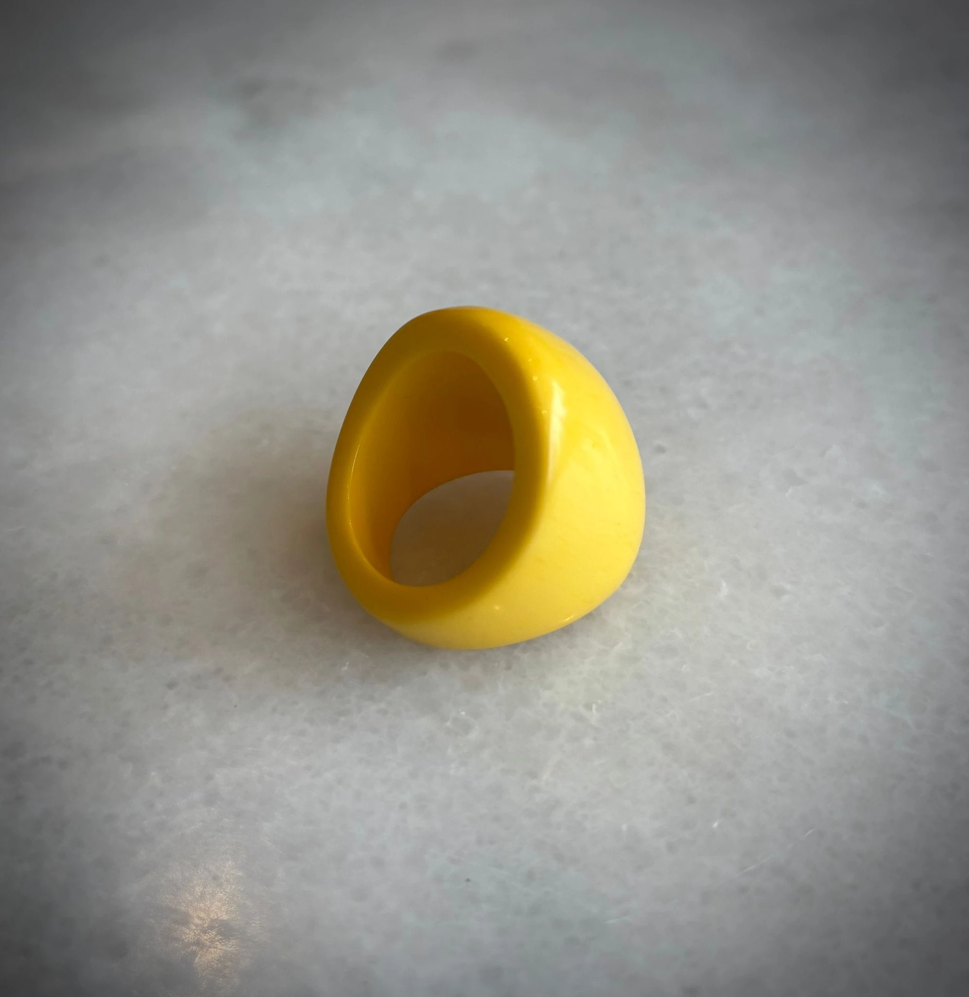 Pierścionek Twins w żółtej odsłonie. Wykonany z żółtego akrylu . To połączenie klasycznego projektu z nowoczesnym wykończeniem — dla wszystkich, którzy kochają oryginalność.