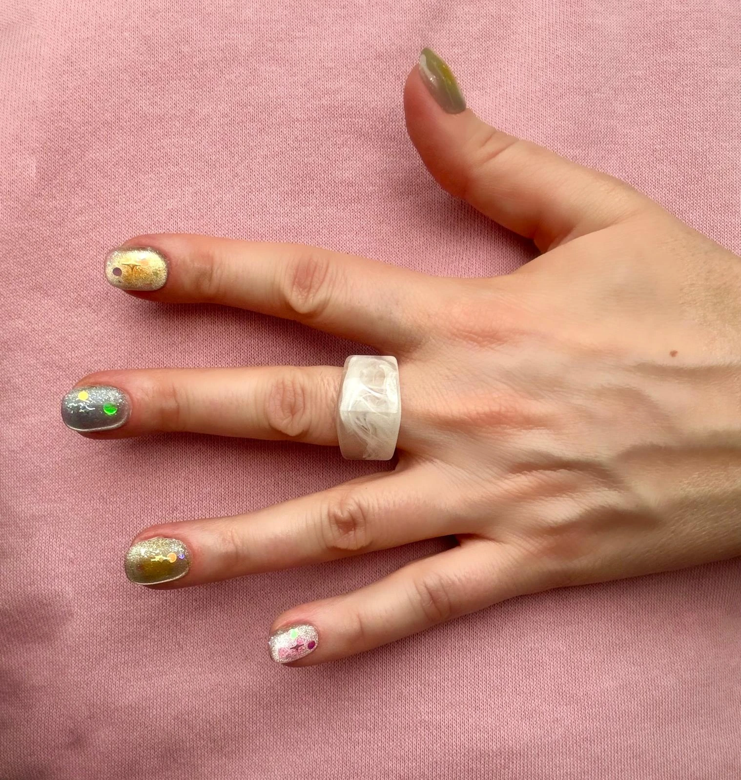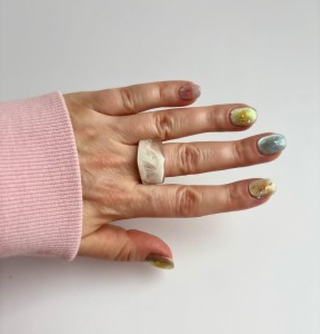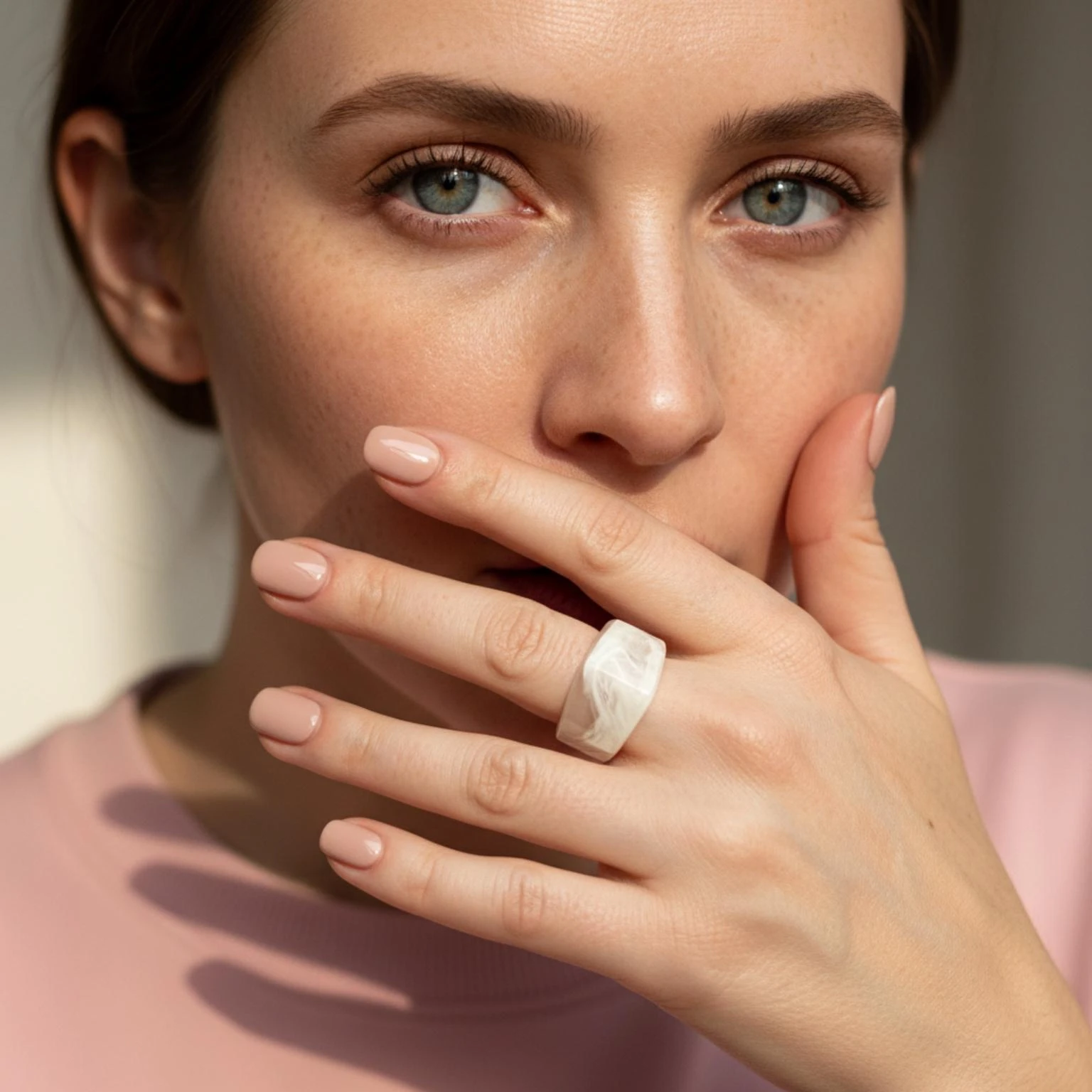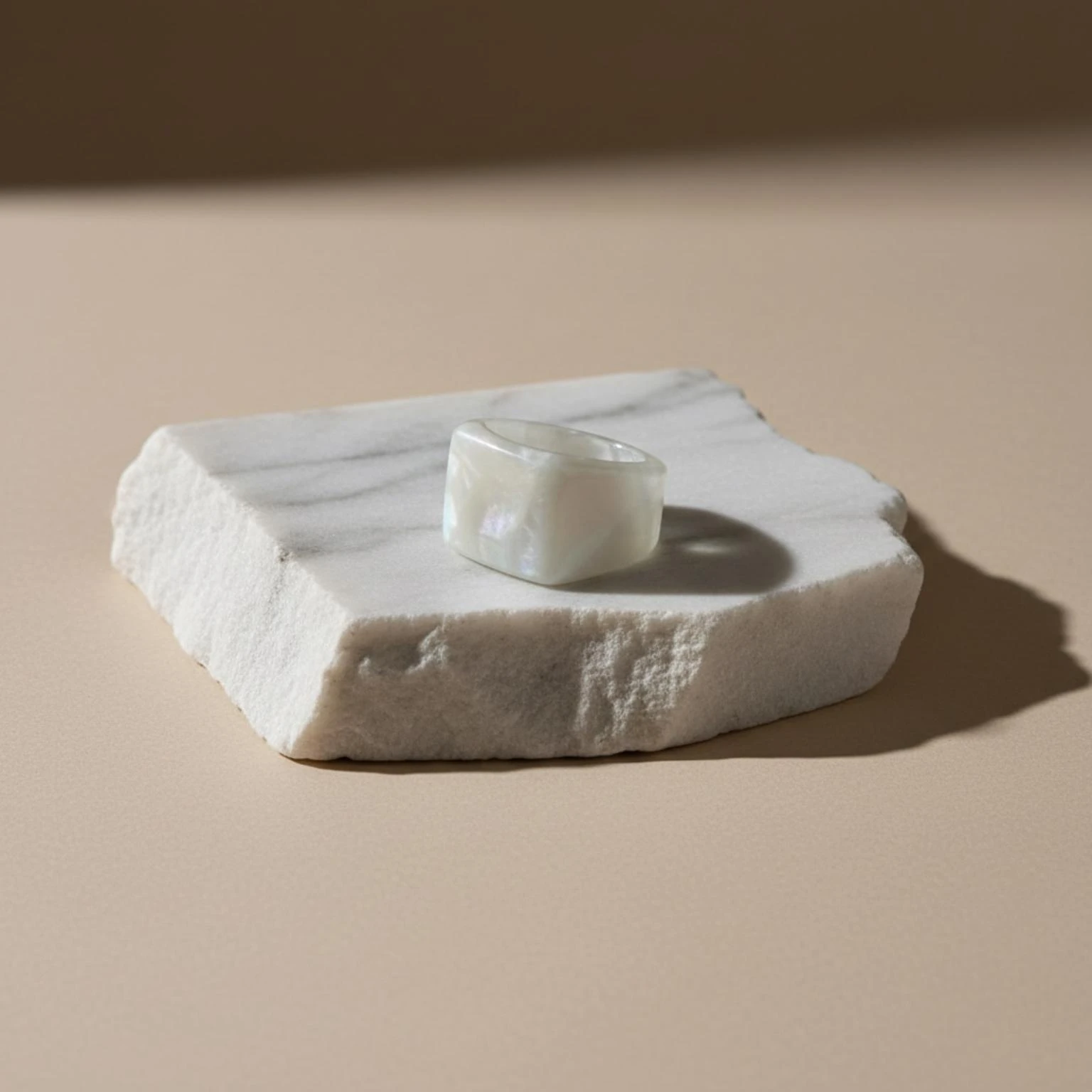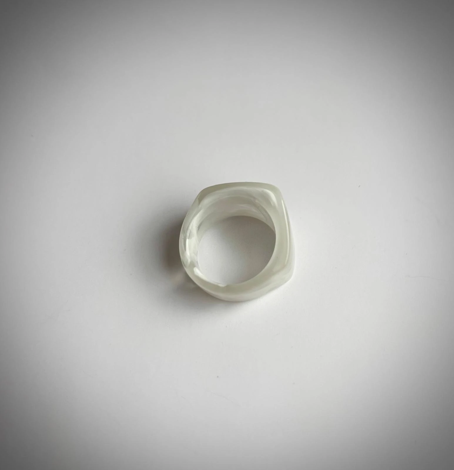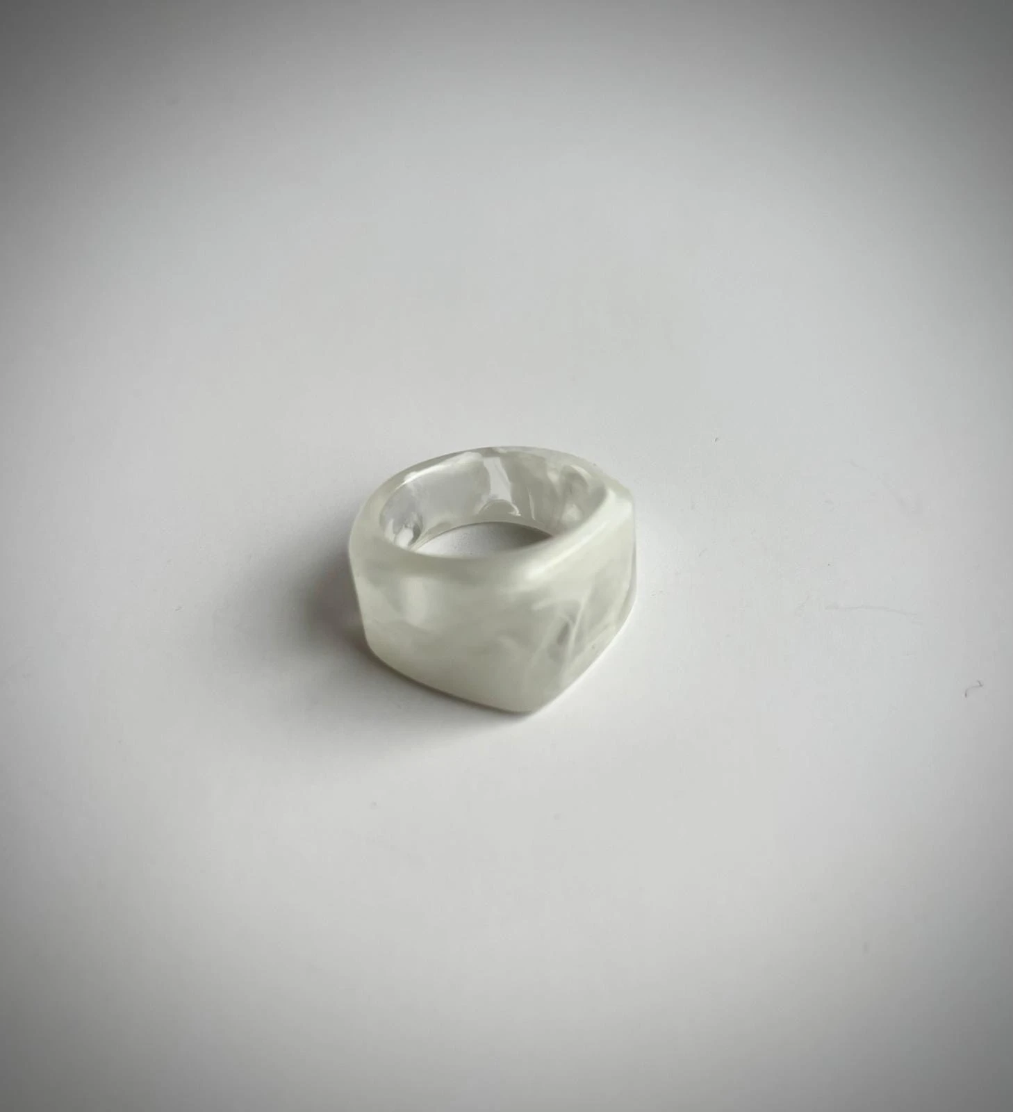 Pierścionek Twins w białej odsłonie. Wykonany z białego akrylu . To połączenie klasycznego projektu z nowoczesnym wykończeniem — dla wszystkich, którzy kochają oryginalność.