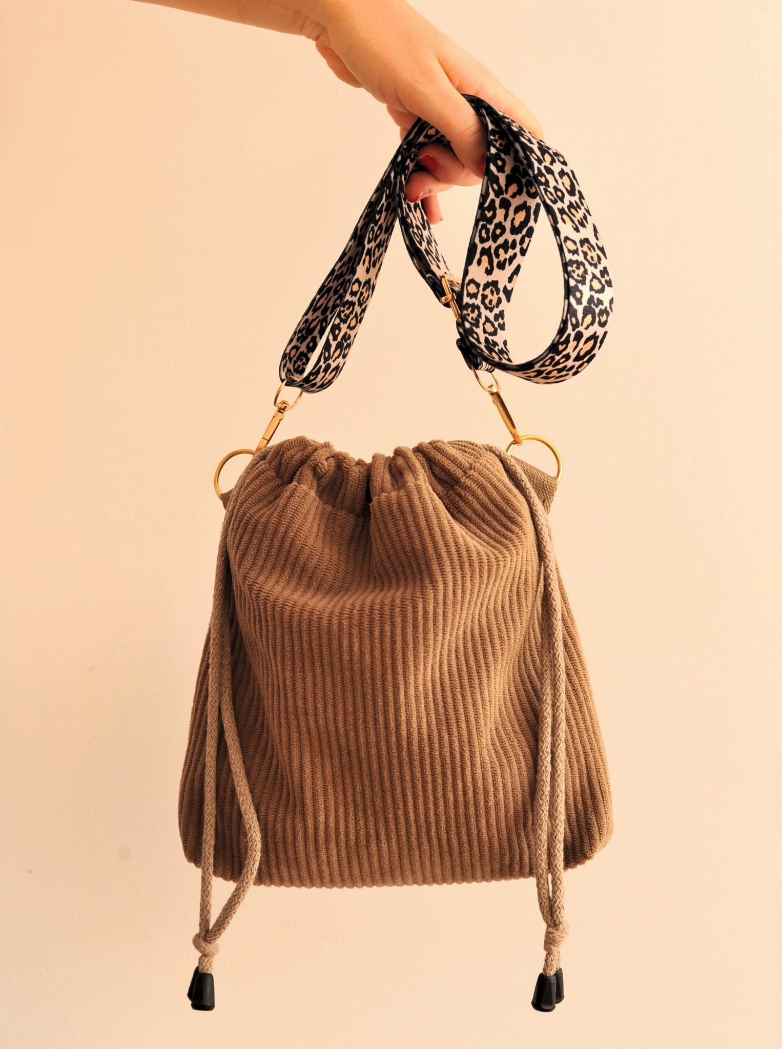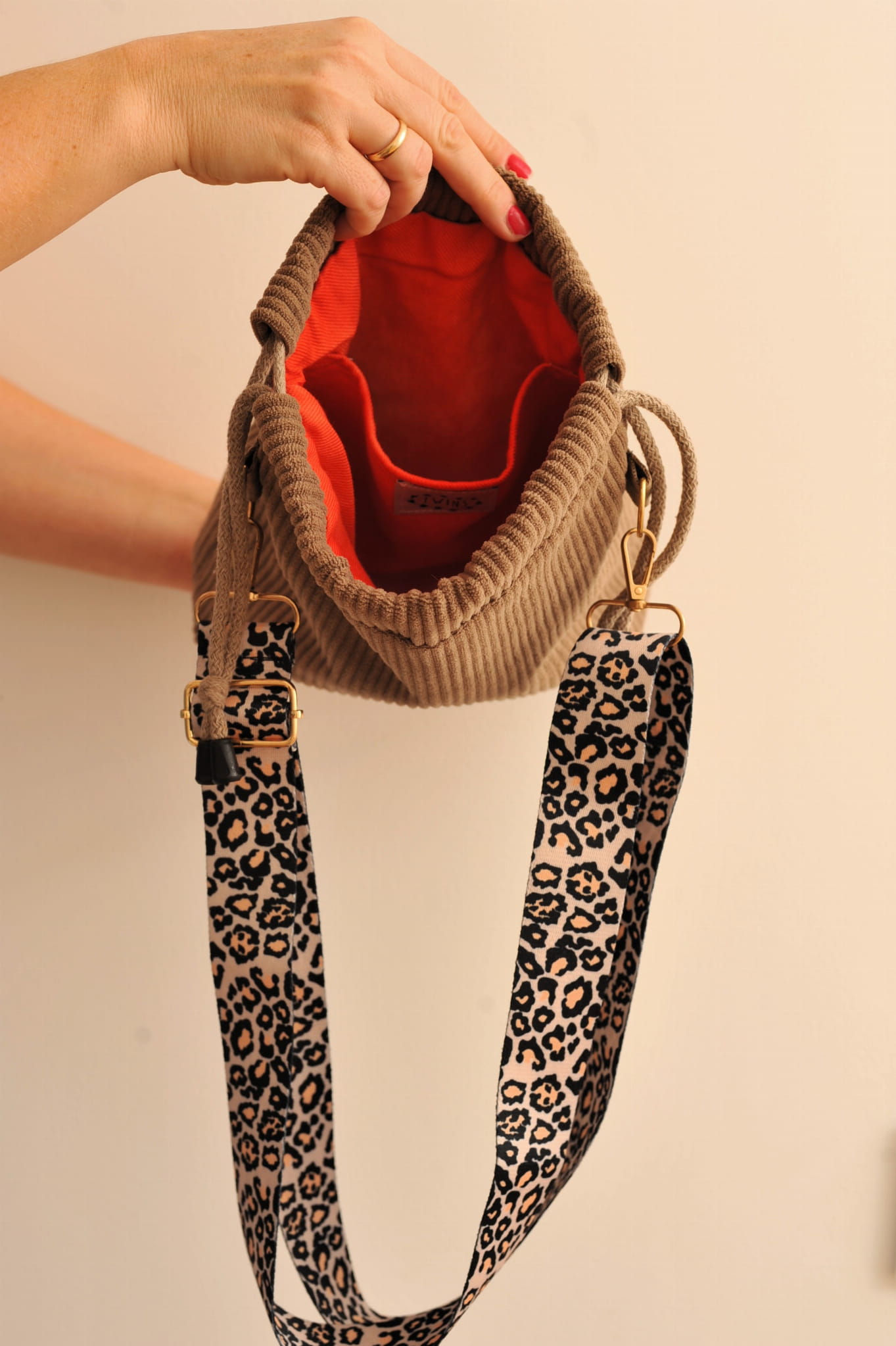 Mała sportowa, torebka Twins alternatywa dla wszechobecnej saszetki. Zaciągana na beżowy sznurek. Wykonany z beżowego sztruksu. W środku podszewka , torebka jest wykonana z tkaniny obiciowej. Rączka to regulowany pasek z printem pantery do zakładania przez głowę. Torebka jest usztywniana . Wymiary: 30(długość)x30(szerokość)x10(bok); w komplecie regulowana rączka parciana.