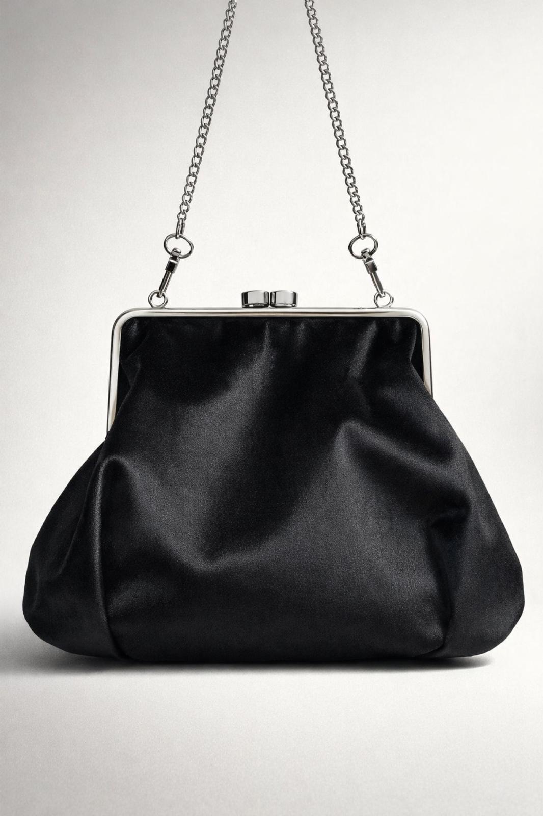 Mała, elegancka torebka zapinana na metalowe, srebrne zapięcie. Wykonana z czarnej tkaniny. typu welwet. W środku podszewka , torebka jest wykonana z tkaniny obiciowej. Rączka to łańcuszek .