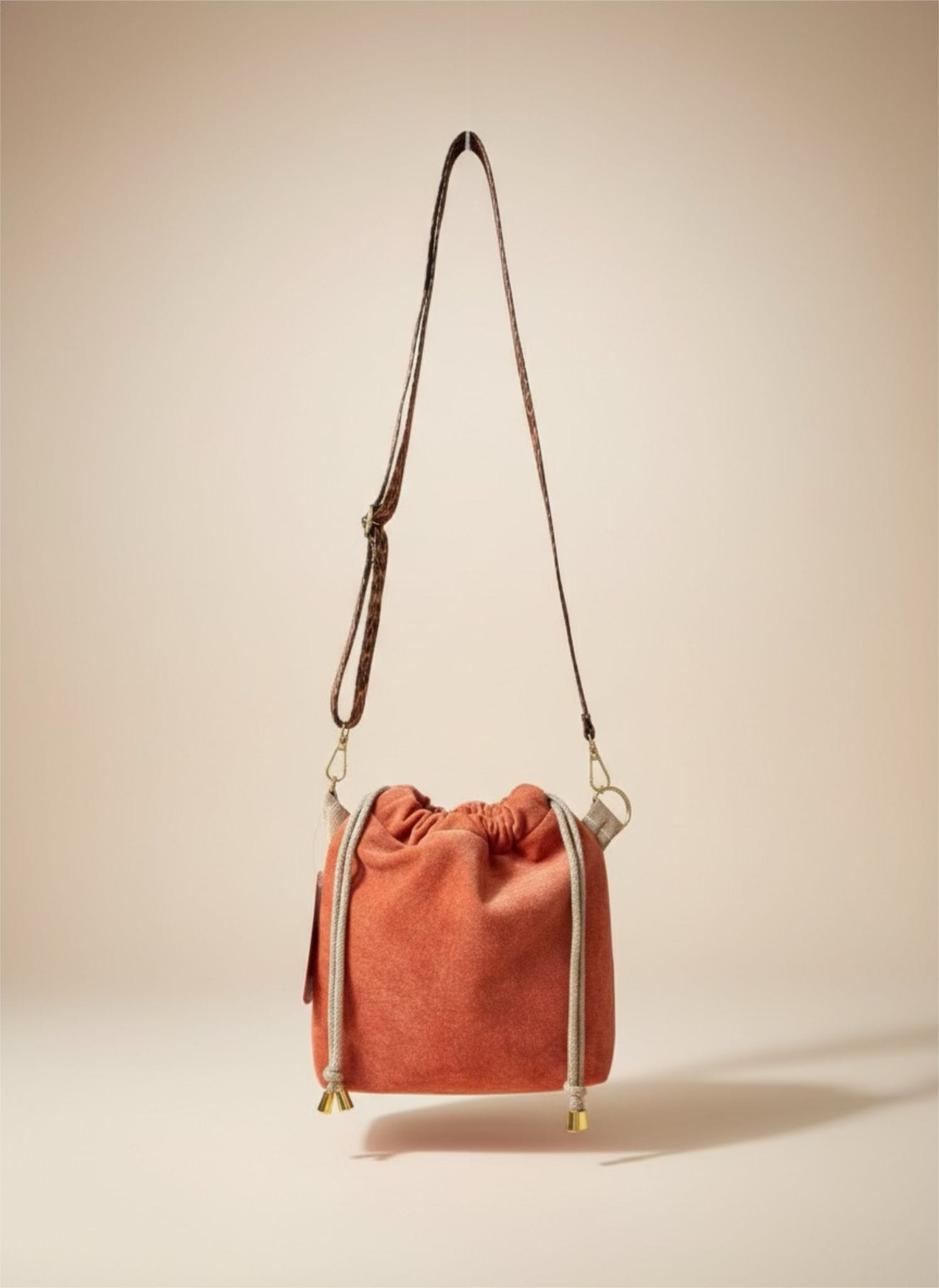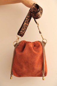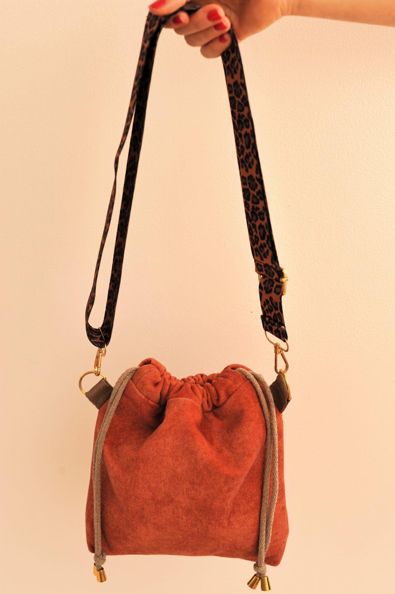 Mała sportowa, torebka Twins ,alternatywa dla wszechobecnej saszetki. Zaciągana na beżowy sznurek. Wykonany z brązowej alcantary. W środku podszewka , torebka jest wykonana z tkaniny obiciowej. Rączka to regulowany pasek z printem pantery do zakładania przez głowę. Torebka jest usztywniana . Wymiary: 30(długość)x30(szerokość)x10(bok); w komplecie regulowana rączka parciana.
