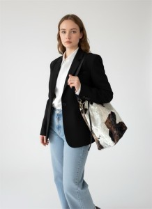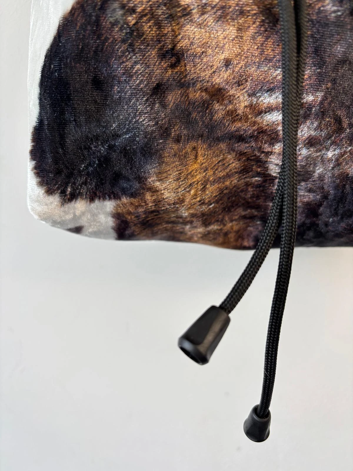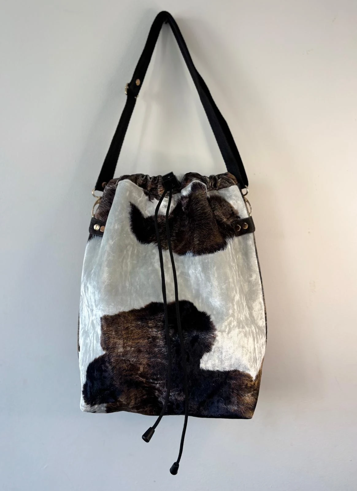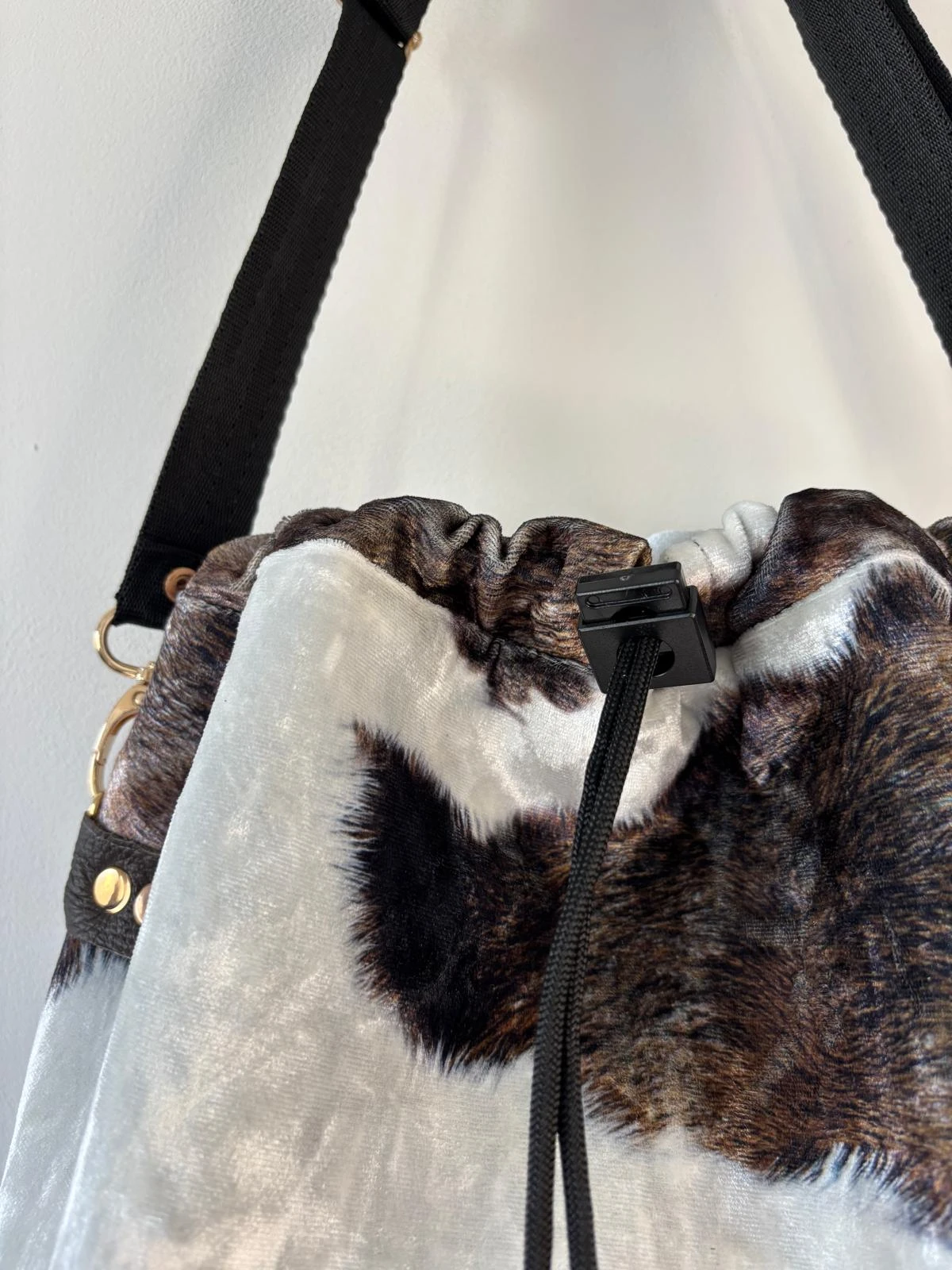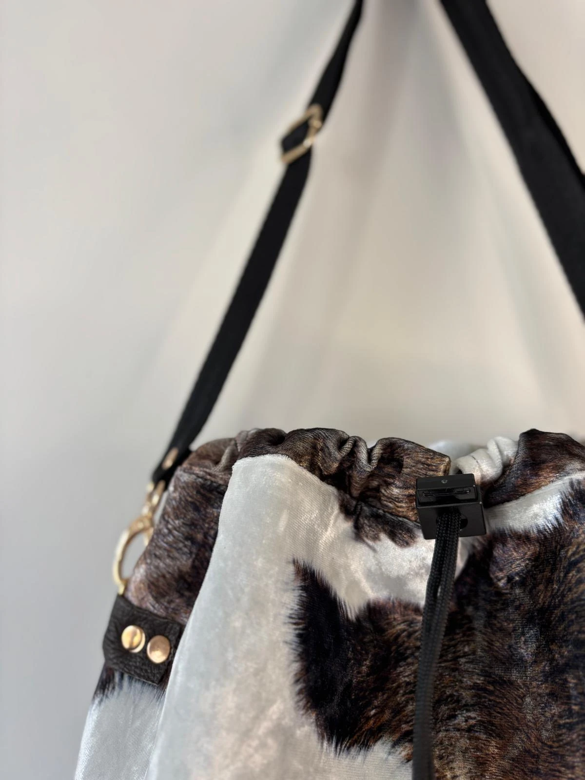 Duża sportowa, torebka zaciągana na czarny sznurek. Wykonana z czarno-brązowo-białej, tkaniny. Z printem krowy. W środku podszewka , torebka jest wykonana z tkaniny obiciowej. Rączka to regulowany pasek do zakładania przez głowę. Torebka jest usztywniana . Wymiary: 30(długość)x30(szerokość)x10(bok); w komplecie regulowana raczka parciana.