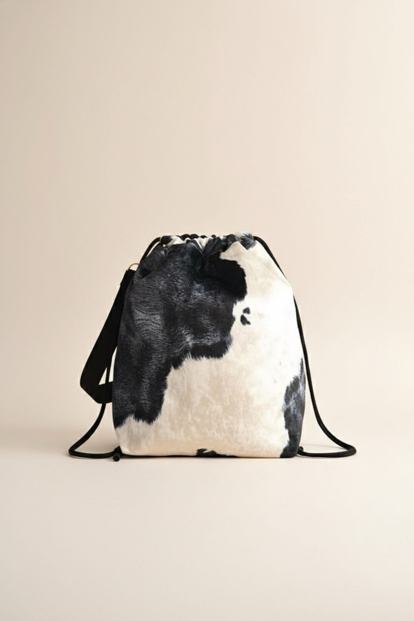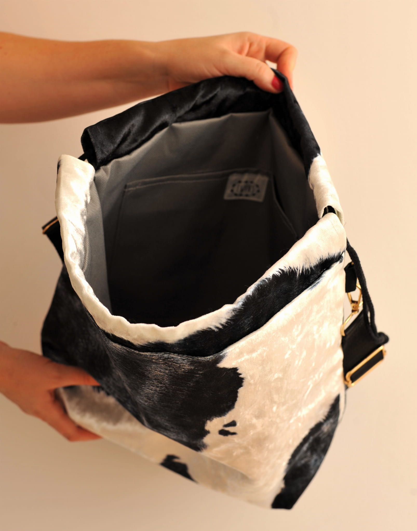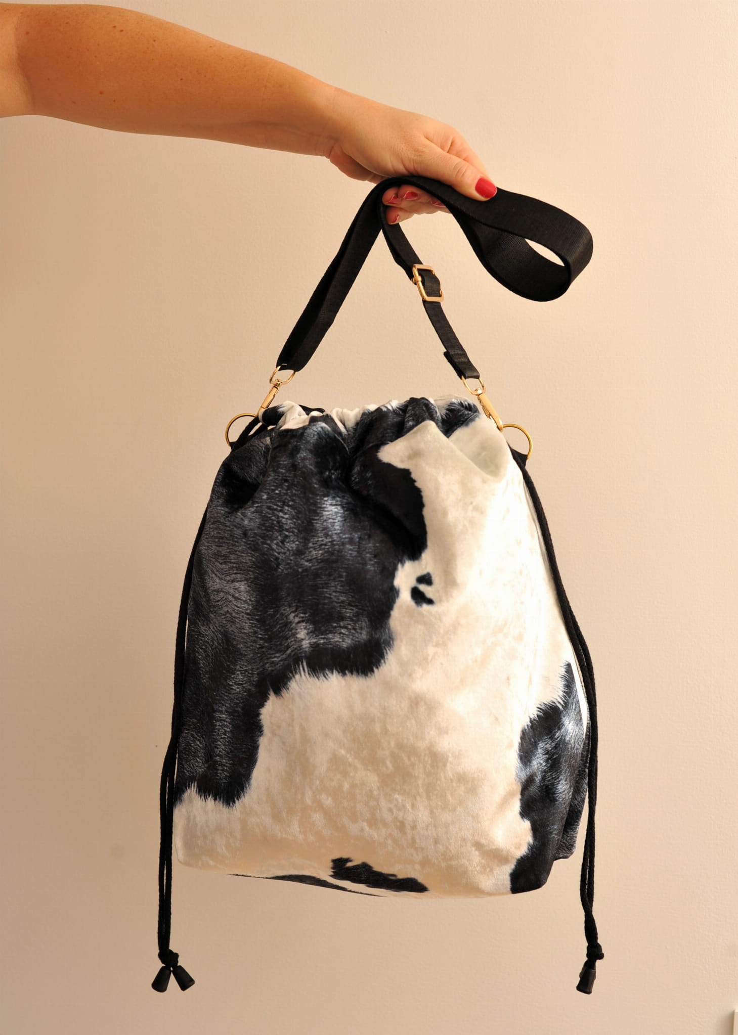 Duża sportowa, torebka zaciagana na czarny sznurek. Wykonana z czarno-białej, tkaniny. Z printem krowy. W środku podszewka , torebka jest wykonana z tkaniny obiciowej. Rączka to regulowany pasek do zakładania przez głowę. Torebka jest usztywniana . Wymiary: 30(długość)x30(szerokość)x10(bok); w komplecie regulowana raczka parciana.