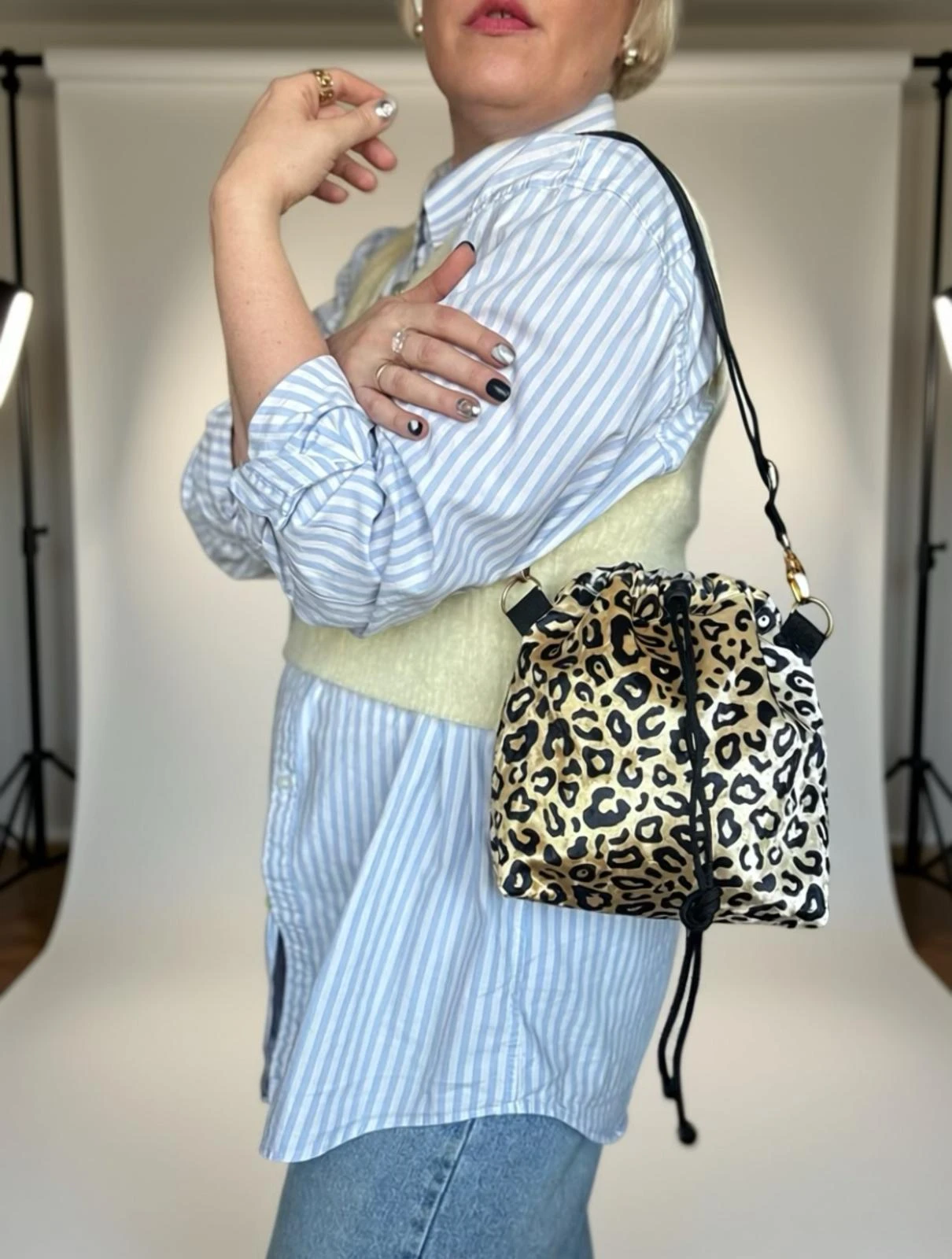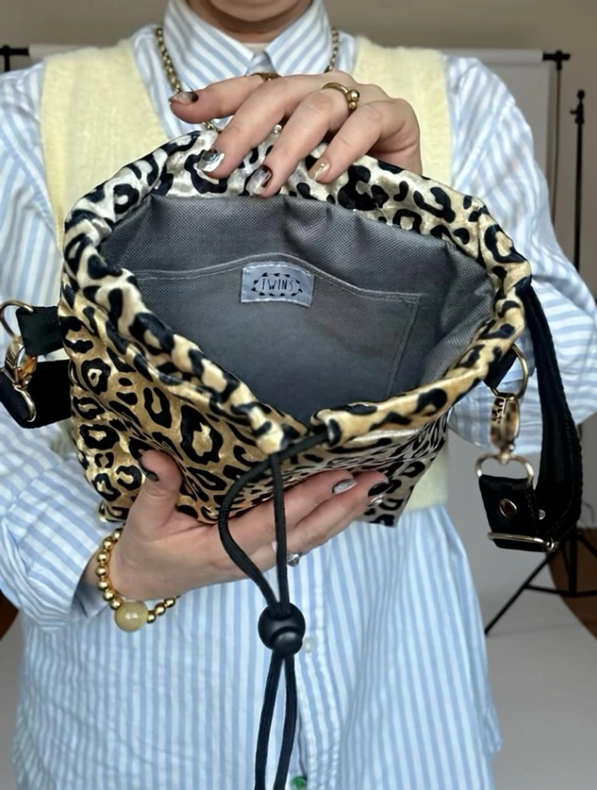 Mała sportowa, torebka Twins alternatywa dla wszechobecnej saszetki. Zaciągana na czarny sznurek. Wykonany z tkaniny z wzorem panterki. W środku podszewka , torebka jest wykonana z tkaniny obiciowej. Rączka to regulowany czarny pasek z do zakładania przez głowę. Torebka jest usztywniana . Wymiary: 30(długość)x30(szerokość)x10(bok); w komplecie regulowana rączka .