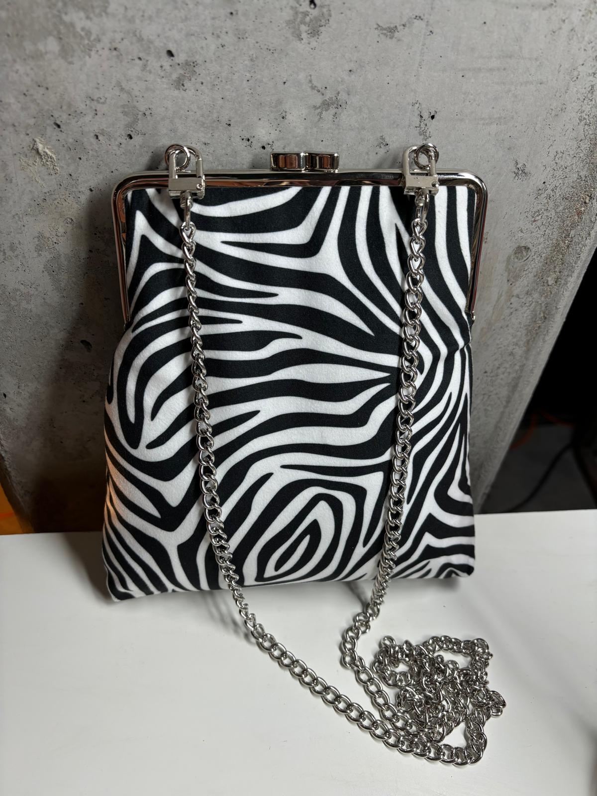 Mała, elegancka torebka zapinana na metalowe, srebrne zapięcie. Wykonana z czarno-bialej, tkaniny. Print zebry. W środku podszewka , torebka jest wykonana z tkaniny obiciowej. Rączka to łańcuszek do zakładania przez głowę lub cienki parciany pasek .