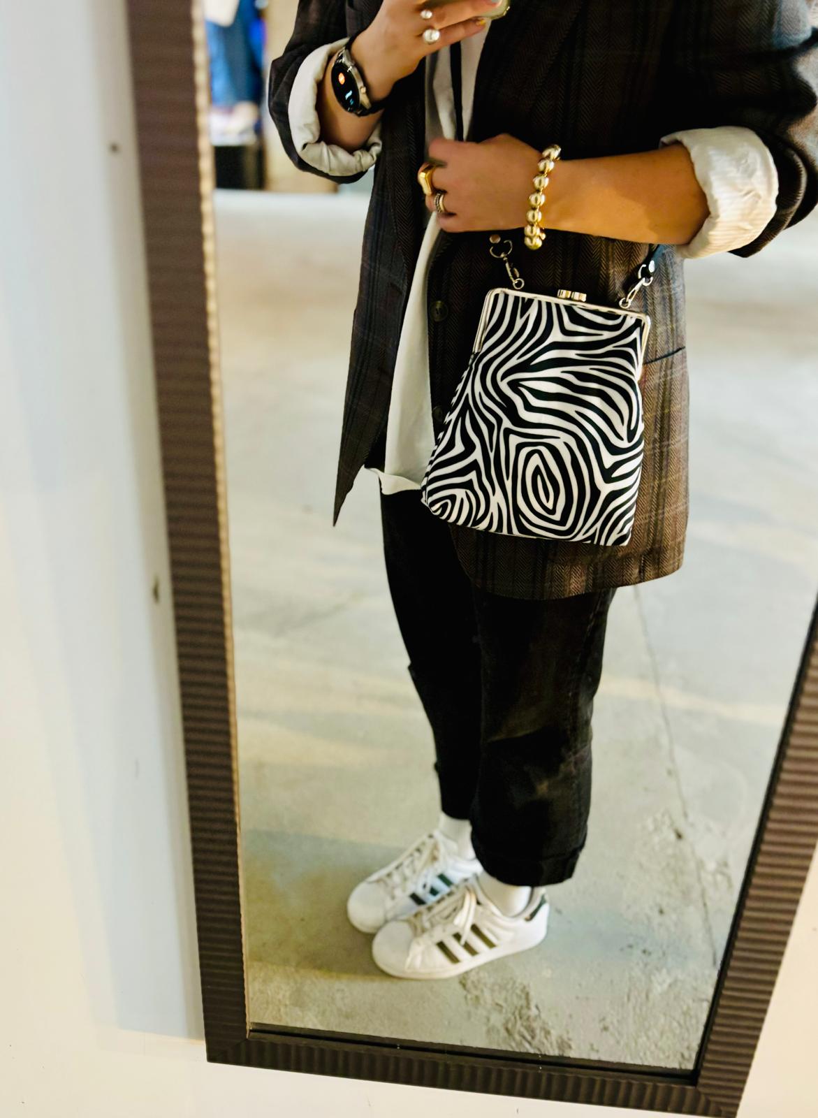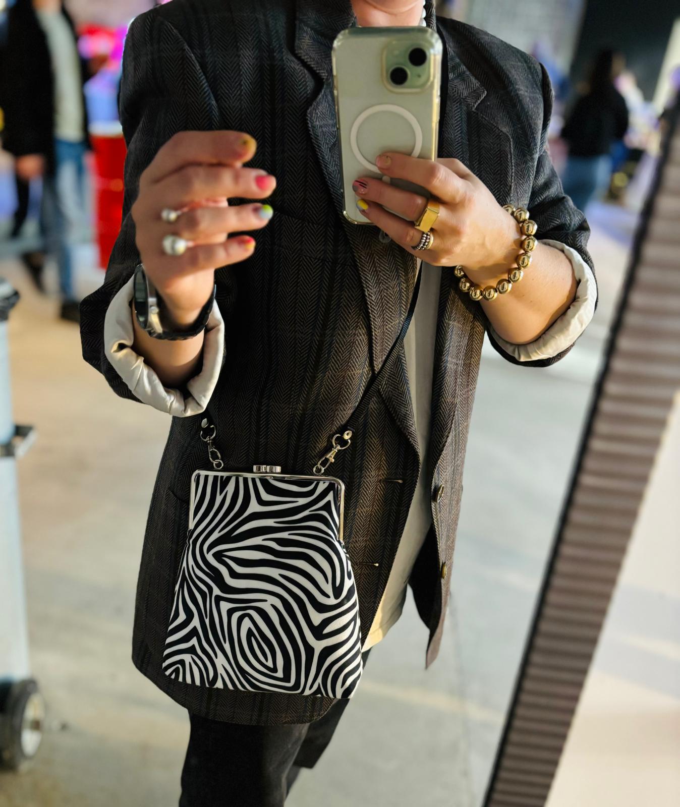Mała, elegancka torebka zapinana na metalowe zapięcie. Print zebry.