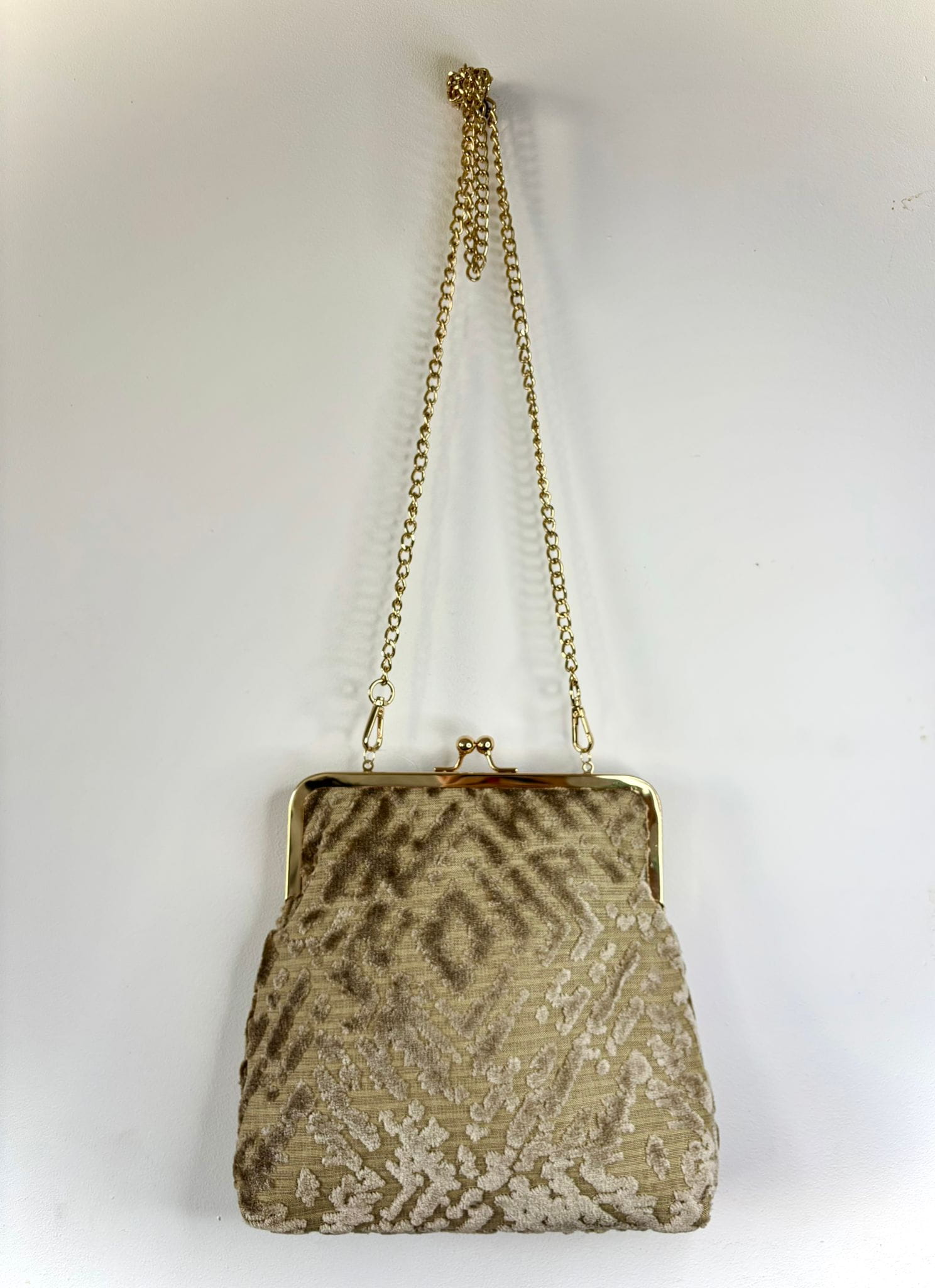 Mała, elegancka torebka zapinana na metalowe, zapięcie koloru złotego. Wykonana z beżowej tkaniny typu zamsz welwet. W środku podszewka, torebka jest wykonana z tkaniny obiciowej.