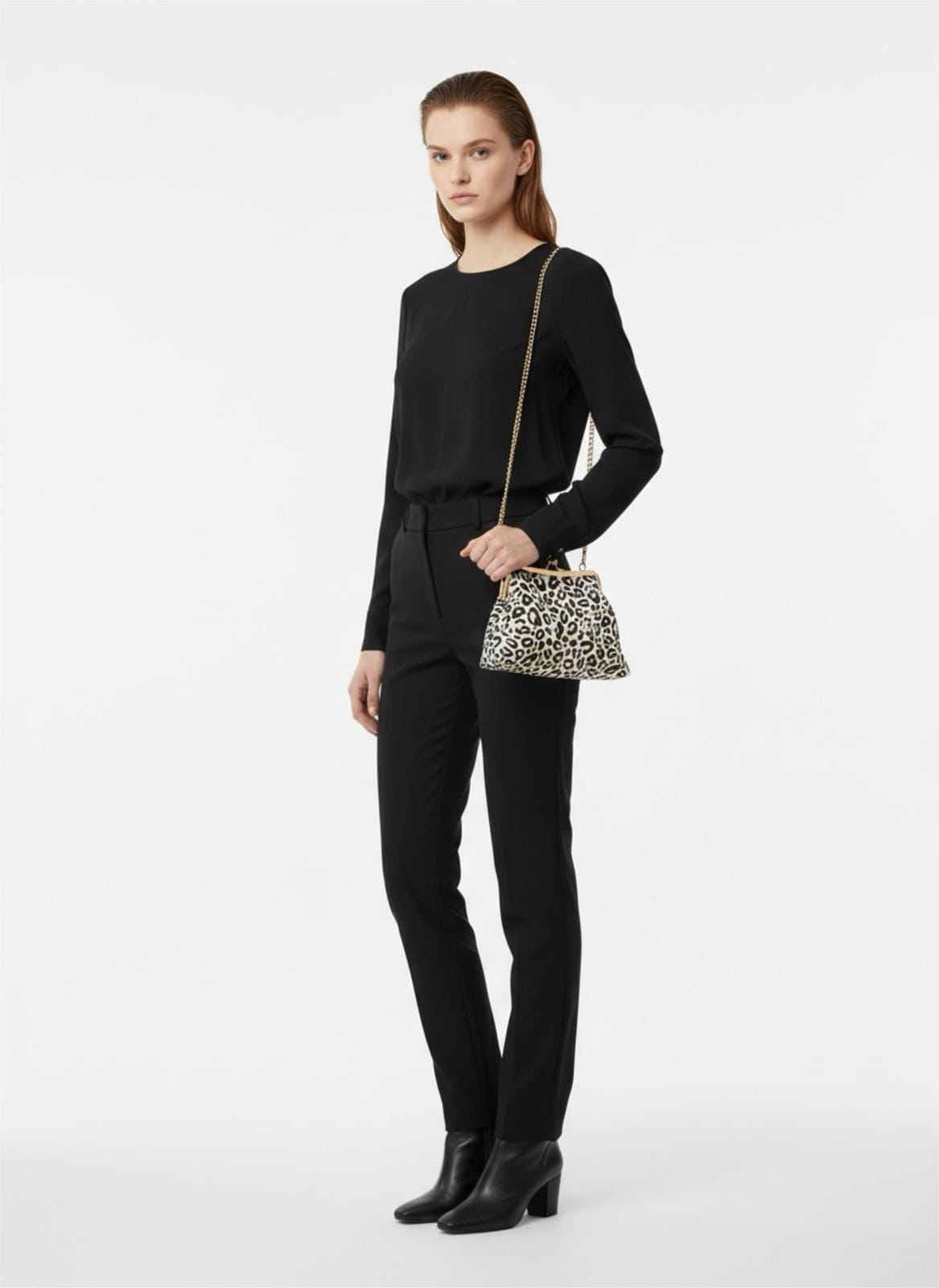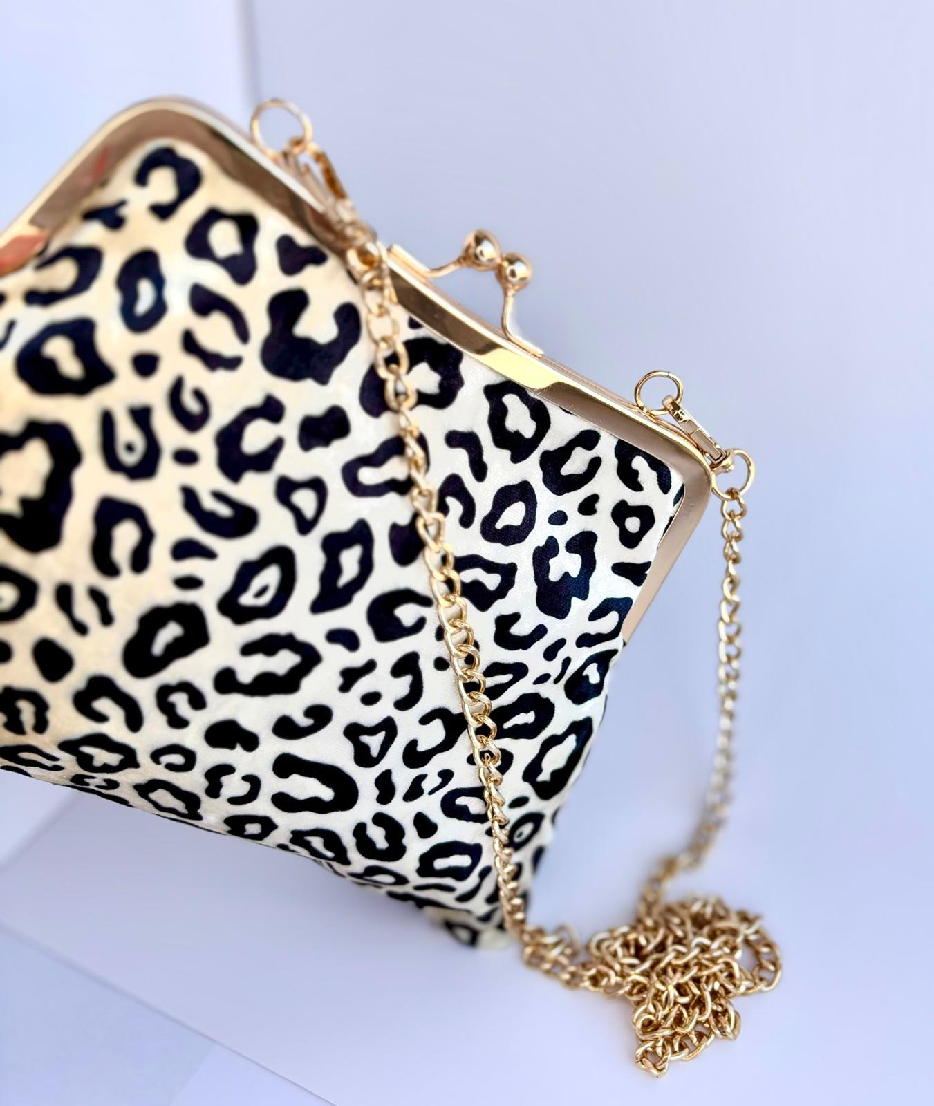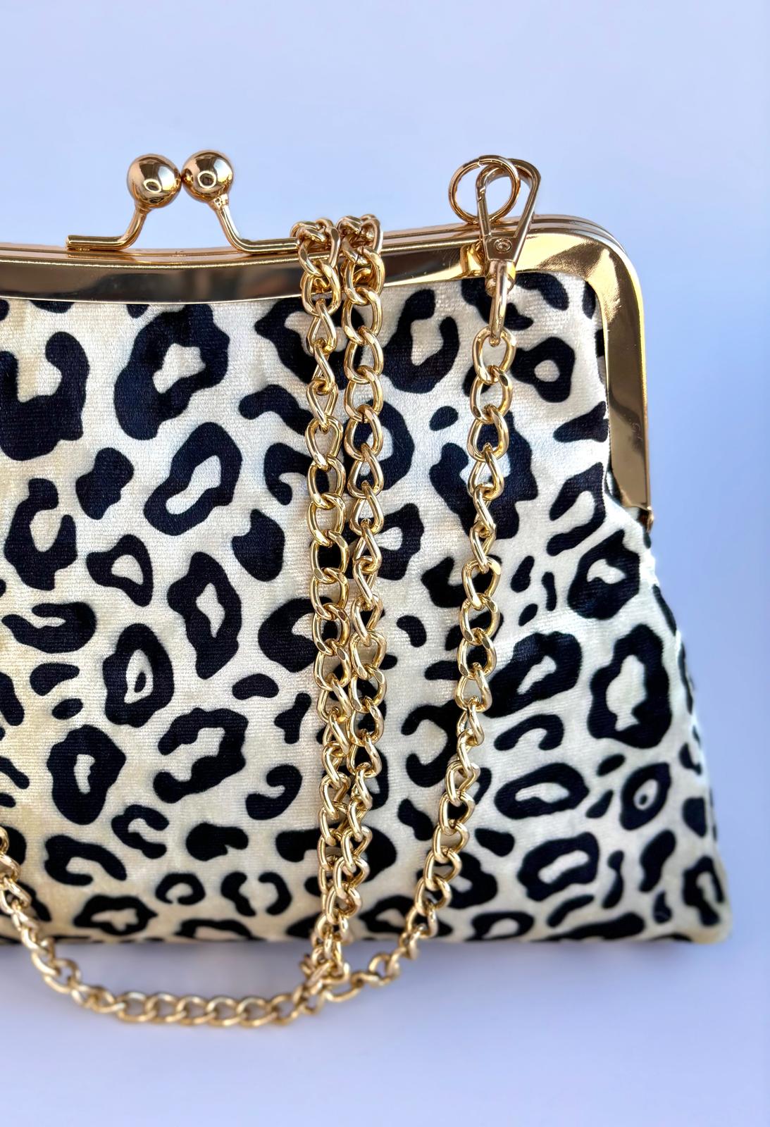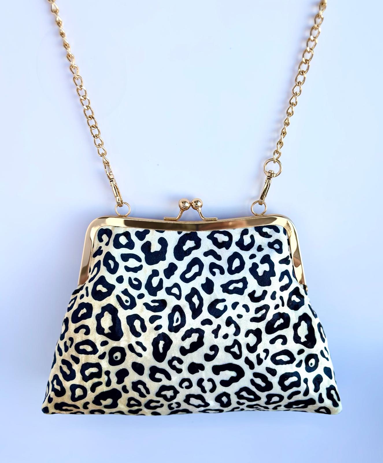 Mała, elegancka torebka na bigla marki Twins zapinana na metalowe, zapięcie koloru złotego. Wykonana z tkaniny typu welwet. Tkanina z wzorem pantery . W środku podszewka, torebka jest wykonana z tkaniny obiciowej.